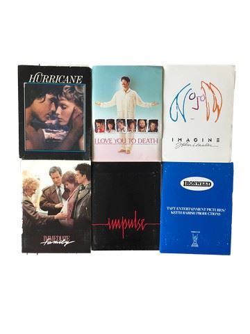 Collection of 6 press kits with black and white publicity stills included, sized mainly 8x10's, from various movie studios. (1970's-80's). From Paramount Pictures "Hurricane"(1979), From Columbia Pictures "Immediate Family" (1989), From Tri Star "I Love You To Death"(1990), From Warner Brothers "Imagine" by John Lennon (1988), From 20th Century Fox "Impulse" (1984), From Tri Star "Iron Weed" (1987).