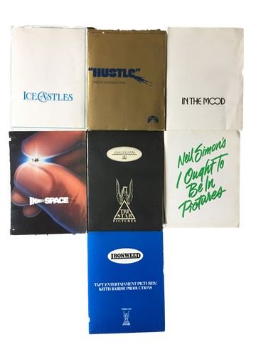 Collection of 7 press kits with black and white publicity stills included, sized mainly 8x10's, from various movie studios. (1970's-80's). From Columbia Pictures "Ice Castles" (1978), From Paramount Pictures "Hustle" (1975), From Lorimar "In The Mood" (1987), From Warner Brothers "Inner Space"(1987), From Tri Star "Iron Eagle 2" (1988), From 20th Century Fox "Neil Simon's I Ought To Be In Pictures" (1982), From Tri Star "IronWeed" (1987).
