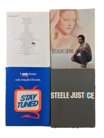 Collection of 4 press kits with black and white publicity stills included, sized mainly 8x10's from various movie studios (1980's-90's). From Warner Brothers "Stealing Home" (1988) starring Mark Harmon as Billy Wyatt, Jodie Foster as Katie Chandler, and Harold Ramis as Alan Appleby, includes 3 stills. From Atlantic Releashin Corporation "Steele Justice"(1987) starring Martin Kove as John Steele, Sela Ward as Tracy, and Ronny Cox as Bennett, includes 9 stills. From Morgan Creek Productions "Stay Tuned" (1992) starring John Ritter as Roy Knable, Pam Dawber as Helen Knable, and Jeffrey Jones as Spike, includes 2 stills. From Paramount Pictures "Star Trek IV The Voyage Home" (1986) starring William Shatner as James T Kurk, Leanord Nemoy as Spock, and Catherine Hicks as dr Gillian Taylor, no stills included.