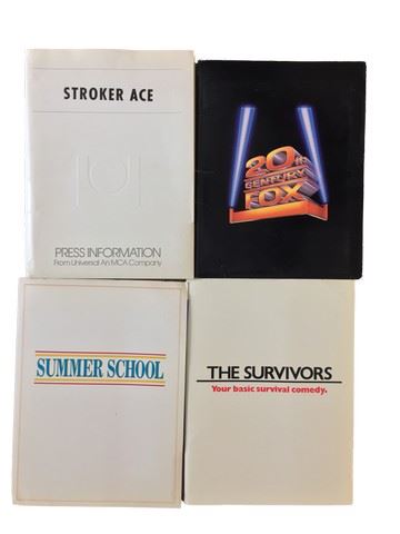 Collection of 4 press kits and black and white publicity stills included, sized mainly 8x10's from various movie studios (1980's). From Columbia Pictures "The Survivors" (1983) starring Robin Williams as Donald Quinelle, Walter Matthau as Sonny Paulso, and Jerry Reed as Jack Locke, includes 9 stills. From Universal Studios "Stroker Ace" (1983) starring Burt Reynolds as Stroker Ace, Ned Beatty as Clyde Torkle, and Loni Anderson as Pembrook Feeny, includes 36 stills. From 20th Century Fox "The Stone Boy" (1984) starring Robert Duvall as Joe Hillerman, Jason Presson as Arnold Hillerman, and Glenn Close as Ruth Hillerman, includes 7 stills. From Paramount Pictures "Summer School" (1987) starring Mark Harmon as Freddy Shoop, Kirstie Alley as Robin Bishop, and Robin Thomas as Vice Principal Phil Gillis, includes 14 stills.