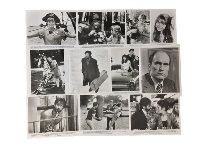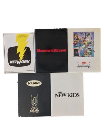 Collection of 5 publicity kits with black and white publicity stills included in each, mainly 8"x10"s, ~50 in all (circa 1980's). From United artists, Columbia Pictures, and Tri-Star. From Columbia pictures "New kids" (1985), a brother and sister move to Florida and end up fighting local hoodlums led by a twisted drug dealer, starring Laurie Loughlin as Abbie McWilliams, and James spader as Eddie Dutra. From Columbia Pictures "The New Adventures of Pippi Longstocking", (1988), adventure and fantasy with the precocious Pippi Longstocking who falls off her father's pirate ship and washes up in a small coastal town in Florida. From Columbia Pictures "Moscow on the Hudson"(1984), a Russian musician defects to the United States and settles in New York with the help Bloomingdale's employee, starring Robin Williams as Vladimir Ivanoff, and Maria Conchita Alonso as Lucia Lombardo. From Tri-Star Pictures "Nadine" (1987), a hairdresser wants to retrieve risky photos of herself, when she visits the photographer she finds him dead, starring Kim Bassinger as Nadine Hightower, Jerry stiller as Raymond Escobar, and Jeff Bridges as Vernon Hightower. From United Artists "Network", (1976) starring Faye Dunnaway as Diane Christenson, William Holdon as Max Schumacher, and Peter Finch as Howard Beele. Each press kit contains a set of publicity stills.