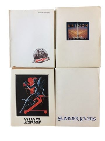 Collection of 4 press kits with black and white publicity stills included, sized mainly 8x10's from various movie studios (1970's-80's). From MGM Entertainment Company "Strange Brews"(1983) starring Dave Thomas as Doug McKenzie, Rick Moranis as Bob McKenzie, and Max Von Sydow as Brewmeister Smith, includes 5 stills. From Nelson Entertainment "Street Fight" (1975) by Ralph Bakshi's animation includes 3 stills. From 20th Century Fox "The Stunt Man" (1980) starring Peter O Toole as Eli Cross, Steve Railsback as Cameron, and Barbara Hershey as Nina Franklin, includes 6 stills. From Filmways Pictures "Summer Lovers" starring Peter Gallager as Michael Pappas, Daryl Hannah as Cathy Featherstone, and Valerie Quennessen as Lina Broussard, includes 12 stills.