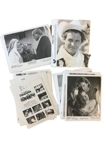 Collection of 4 press kits with black and white publicity stills include, sized mainly 8x10's from various movie studios. (1980's). Also included is a collection of ~75 black and white publicity stills from other movies. From New Century/Vista Film Company "Russkies" (1987) starring Joaquin Phoenix as Danny, Whip Hubley as Mischa, and Peter Billingsley as Adam, includes 11 stills. From Warner Brothers "Running on Empty" (1988) starring River Phoenix as Danny Pope, Matha Plimpton as Lorna Phillips, and Christine Lahti as Annie Pope, includes 4 stills. From MGM "Running Scared" (1986) starring Billy Crystal as Danny, Gregory Hines as Ray, and Darlene Fluegal as Anna, includes 2 stills. From Touchstone Pictures "Ruthless People" (1986) starring Bette Midler as Barbara Stone, Danny DeVito as Sam Stone, and Judge Reinhold as Ken Kessler, includes 2 stills. the collection of stills includes such movies as "The Runner Stumbles" (1979), Rustler's Rhapsody"(1985), "Rollerball" (1985), "Romancing the Stone" (1984), and "Rookie of the Year"(1993).