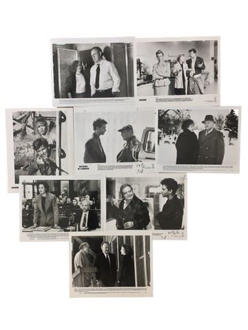 Collection of 5 press kits with black and white publicity stills included (mainly 8"x10"s), ~75 in all circa 1990. From Tri Star Pictures, "Narrow Margin" (1990). When Anne Archer (Carol Hunnicut) witnesses a brutal murder by mobsters she decides to hide out in a remote cabin in the Canadian tundra. Starring Gene Hackman as Robert Caulfield, James Sikking as Nelson, and Susan Hogan as Weller. Includes ~4 stills. "Nadine" (1987), a woman trying to recover photos of herself and divorce her husband, witnesses a murder. Starring Kim Bassinger as Nadine Hightower, Jeff Bridges as Vernon Hightower, and Rip Torn as Bufred Pope (~15 stills included). "The Monster Squad" (1987), a group of pre-teens who idolize classic monster movies, starring Andre Gower as Sean Crenshaw, Robby Kiger as Patrick Rhodes, and Stephen Macht as Detective Del Crenshaw. Publicity stills not included, press kit only. "Nothing In Common" (1986), a successful ad executive is working on a project that could make him partner at his company. When his parents suddenly end their 35 year marriage, he is thrown into the role of caregiver dealing with his frail mother. Starring Tom Hanks as David Basner, Jackie Gleason as Max Basner, and Eva Marie Saint as Lorraine Basner. Includes ~15 stills. "Music Box" (1989), Attorney Ann Talbot (Jessica Lang) leads the defense of a Hungarian immigrant accused of Nazi war crimes. Also starring Armin Mueller-Stahl as Mike Laszio, and Frederic Forrest as Jack Burke. Includes ~10 stills.