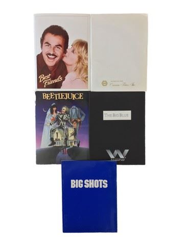 Collection of 5 press kits with black and white publicity stills included, sized mainly 8x10's from various movie studios (circa 1980's). From Cannon Films Inc,. "Barfly" (1987) this is a semi-autobiography of poet and author Charles Bulkowski during the time he spent drinking heavily in Los Angeles, starring Mickey Rourke as Henry Chinaski, Faye Dunaway as Wanda Wilcox, and Alice Krige as Tully Sorenson, 10 stills included. From Warner Brothers "Best Friends"(1982), a screenwriting couple who have managed to work and love together succefully take the leap to get married, however things soon take a turn, starring Goldie Hawn as Paula McCullen, Burt Reynolds as Richard Babson, and Jessica Tandy as Eleanor McCullen, includes 15 stills. From Lorimar Motion Pictures "Big Shots"(1987), starring Darius McCray as Scam, Ricky Busker as Obie, and Robert Prosky as Keegan, includes 9 stills. From Warner Brothers "Beetle Juice"(1988), this is one of the most iconic films from the 80's, produced by the infamous Tim Burton, starring Michael Keaton as Beetlejuice, Alec Baldwin as Adam Maitland, and Geena Davis as Barbara Maitland, 2 stills included. From Weintraub Entertainment Group "The Big Blue" (1988), starring Jean-Marc Barr as Jacques Mayol, Jean Reno as Enzo Molinari, and Rosanna Arquette as Johana Baker, no stills with this kit.