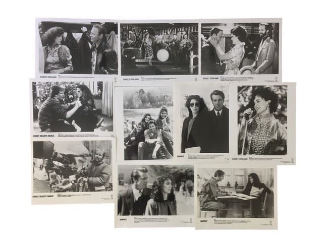 Collection of 3 press kits and 1 release schedule, each kit comes with its own set of black and white publicity stills, mainly 8"x10"s. From Tri Star Pictures (circa 1980's),~50 stills in all. "Sweet Dreams (1985) - this is the story of Patsy Cline played by Jessica Lange, who won Best Actress in a leading role in 1986, also starring Ed Harris as Charlie Dick, Ann Wedgeworth as Hilda Hensley, this press kit also comes with 10 stills and a release kit with 15 stills included. "Suspect" (1987), this is a murder mystery with Cher as Kathleen Riley the lawyer who uncovers a massive conspiracy. Also starring Liam Neeson as Carl Wayne, Dennis Quaid as Eddie Sanger, and Joe Mantegna as Charlie Stella. This comes with 9 stills. "Sweet Hearts Dance" (1988) - this is the story of two small town couples, one married one at the beginning of their relationship, starring Susan Sarandon as Sandra Boon, Don Johnsons as Wiley Boon, and Elizabeth Perkins as Adie Nims. Comes with 15 stills.