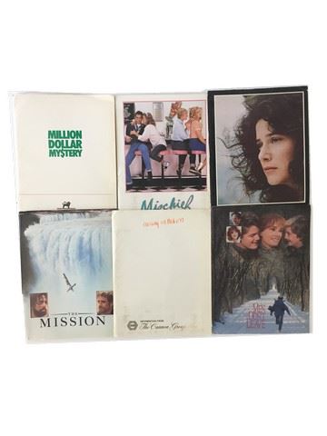 Collection of 6 press kits with black and white publicity stills included, sized mainly 8x10's. (1980's-90's). From DEG "Million Dollar Mystery" (1987), from 20th Century Fox "Mischief"(1985), from The Ladd Company "Mike's Murder" (1983), from Warner Brother's "The Mission" (1986), from The Cannon Group "Missing In Action" (1984), from Geffen Film Company "Men Don't Leave"(1990).