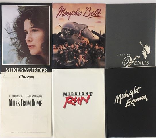 Collection of 6 press kits with black and white publicity stills included, sized mainly 8x10's. (1980's-90's). From The Ladd Company "Mike's Murder"(1984), from Warner Brothers "Memphis Belle"(1990), from Warner Brothers "Meeting Venus" (1991), from Cinecom "Miles From Home" (1988), from Universal "Midnight Run" (1988), from Columbia Pictures "Midnight Express (1978).