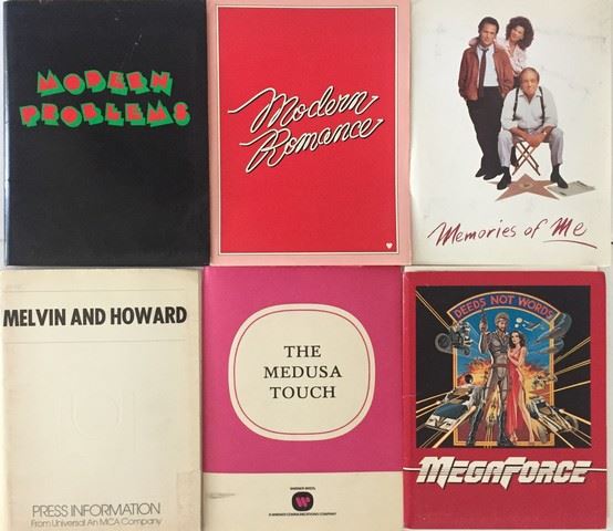 Collection of 6 press kits with black and white publicity stills included, sized mainly 8x10's. (1980's). From 20th Century Fox "Modern Problems" (1981), from Columbia Pictures "Modern Romance (1981), from MGM "Memories of Me" (1988), from Universal "Melvin and Howard" (1980), from Warner Brother's "The Medusa Touch" (1978), from 20th Century Fox "Mega Force" (1982).