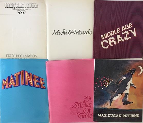 Collection of 6 press kits with black and white publicity stills included, sized mainly 8x10's. (1970's-90's). From Universal "Metalstorm" (1983), from Columbia Pictures "Micki & Maude"(1984), from 20th Century Fox "Middle Age Crazy" (1980), from Universal "Matinee" (1992), from American International Pictures "A Matter of Time" (1976), from 20th Century Fox "Max Dugan Returns" (1983).