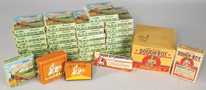 Collection of Prophylactic Boxes. (30) Peacock, (2) Sheik and Doughboy large box and Kit. NOS condition.