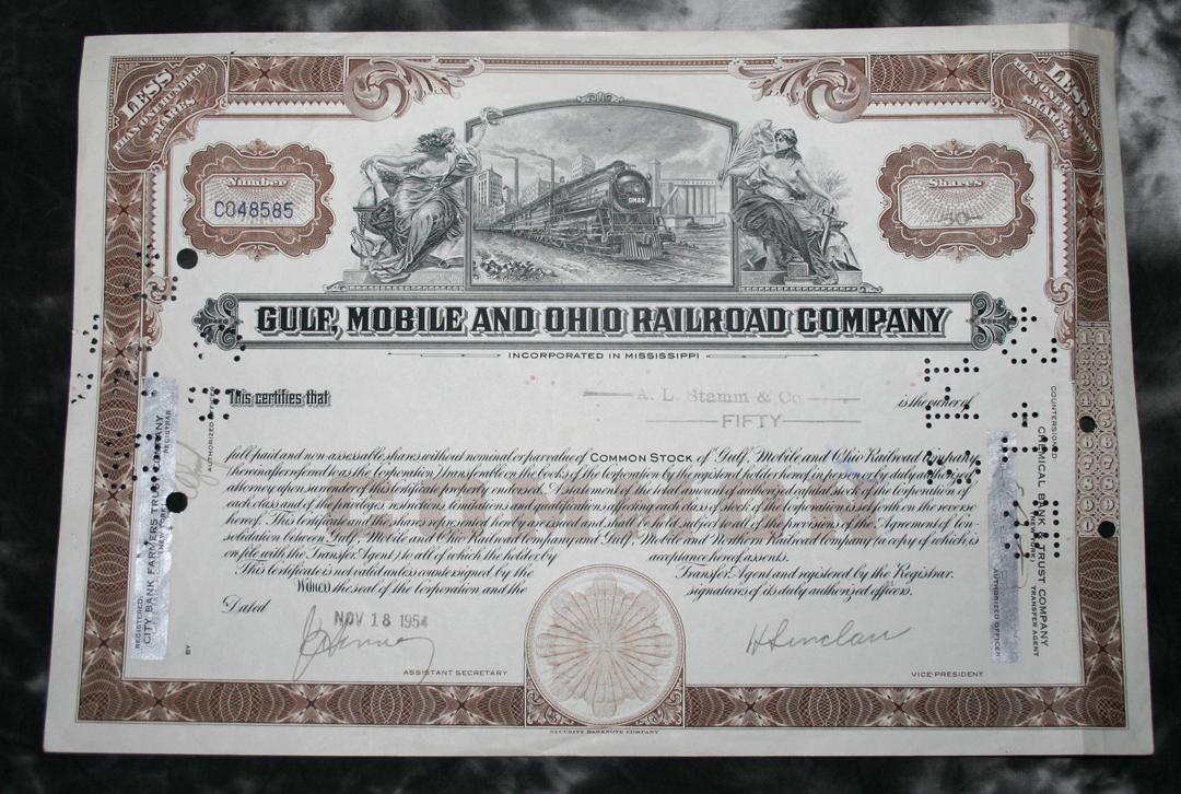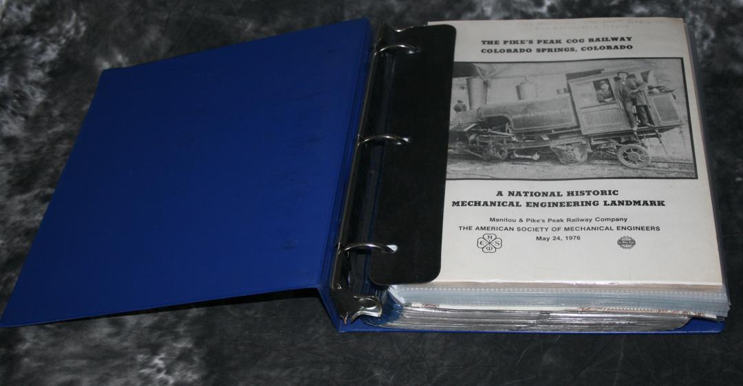 Collection of Railroad Photographs, Stock Certificates & Ephemera; The Pike’s Peak Cog Railway booklet by the American Society of Engineers, Various early bulletins and advertising specs, Calendar Toppers, Photographs – some early & some reprints, Postcards, Engine No. 168 The Rio Grande Booklet, Chicago, Burlington & Quincy Stock Certificate – 100 shares from 1897, Gulf, Mobile & Ohio Railroad Company Stock Certificate – 50 shares from 1954. All stored in a notebook in protective sleeves. Large grouping!