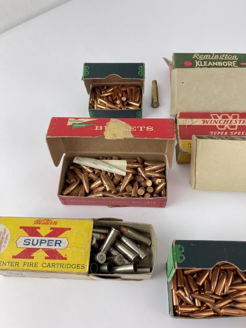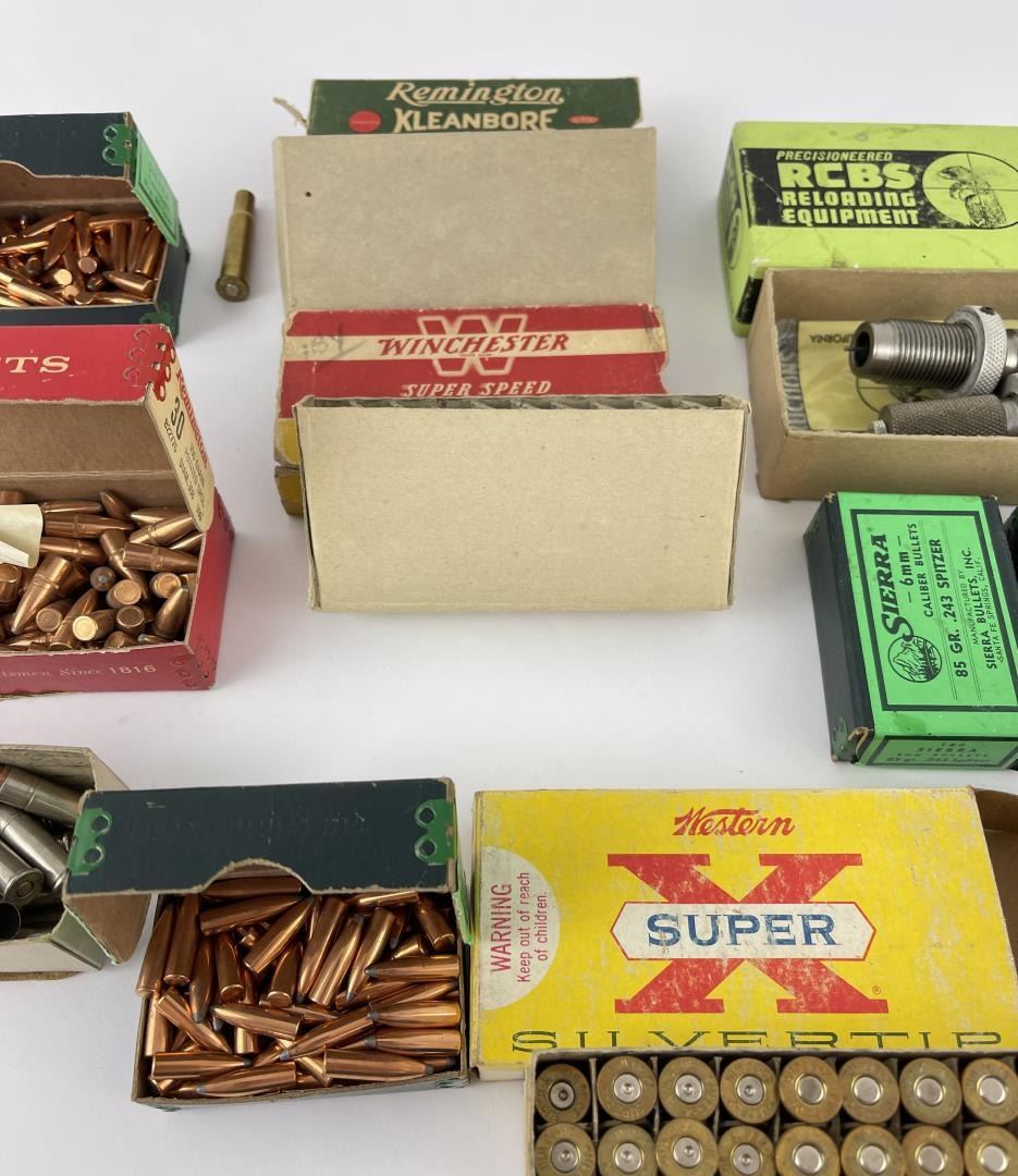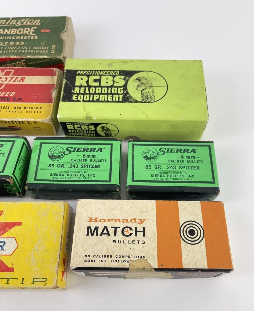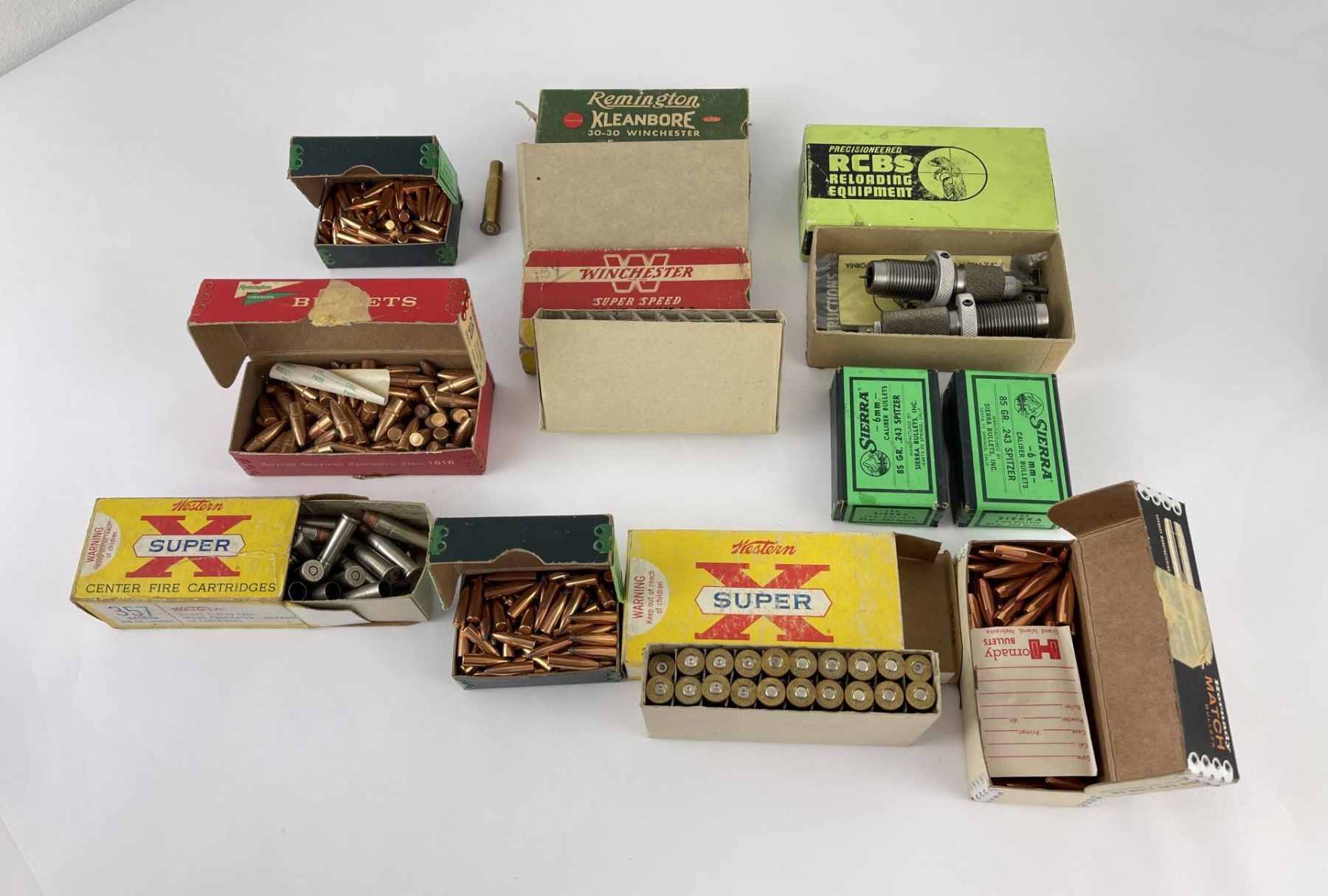 Nice grouping. A handful of loaded rounds, quite a few bullet tips, and a pair of dies.