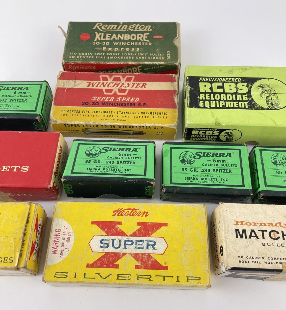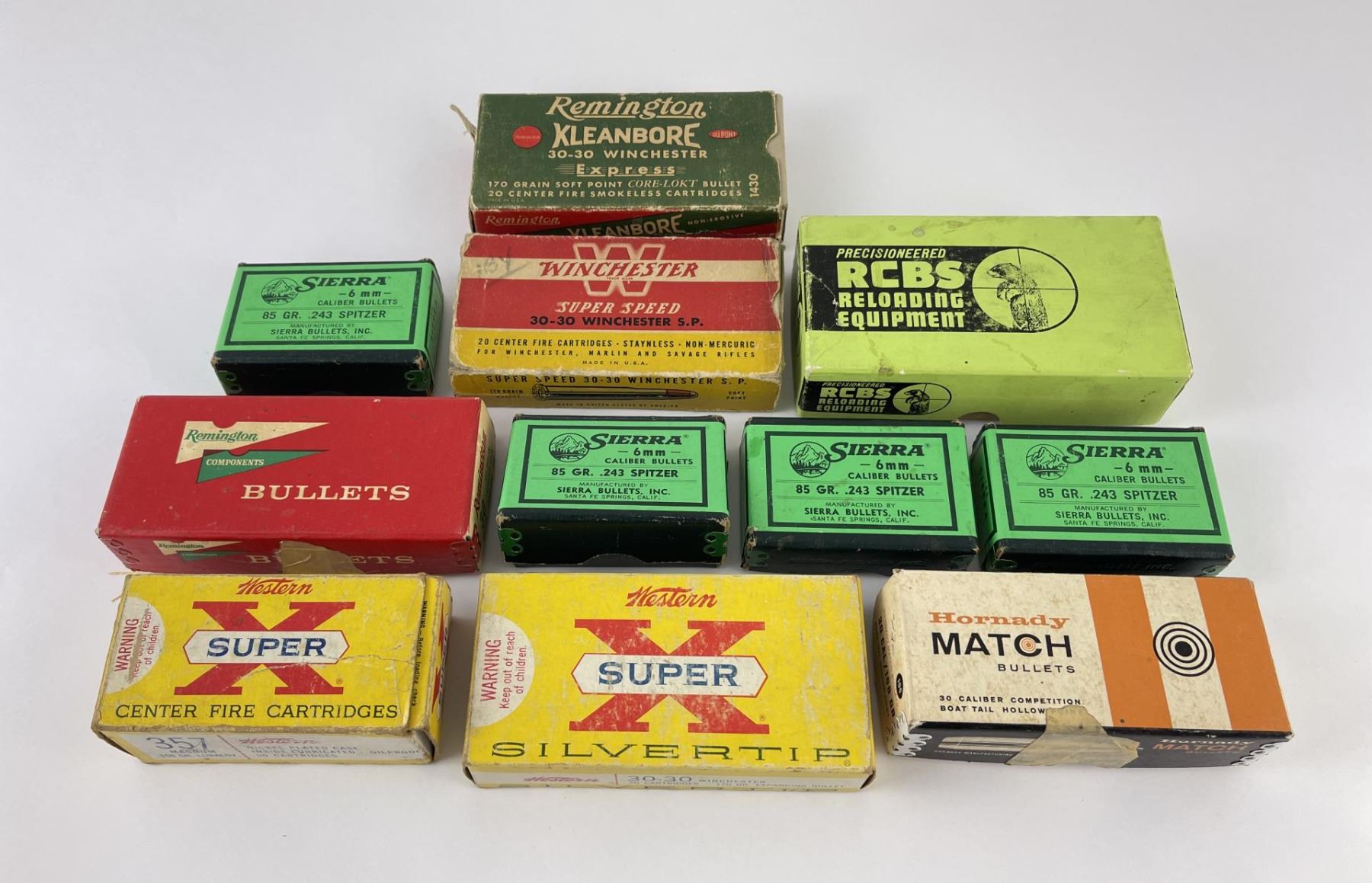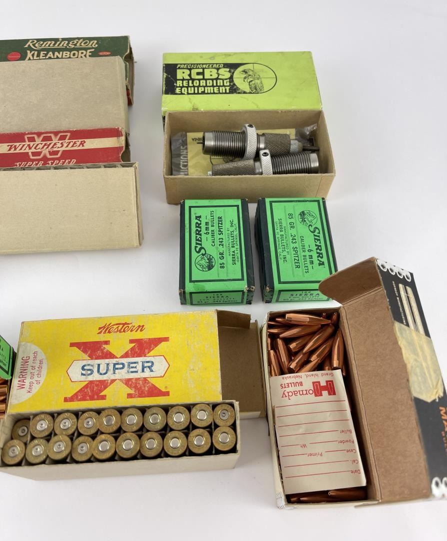 Nice grouping. A handful of loaded rounds, quite a few bullet tips, and a pair of dies.