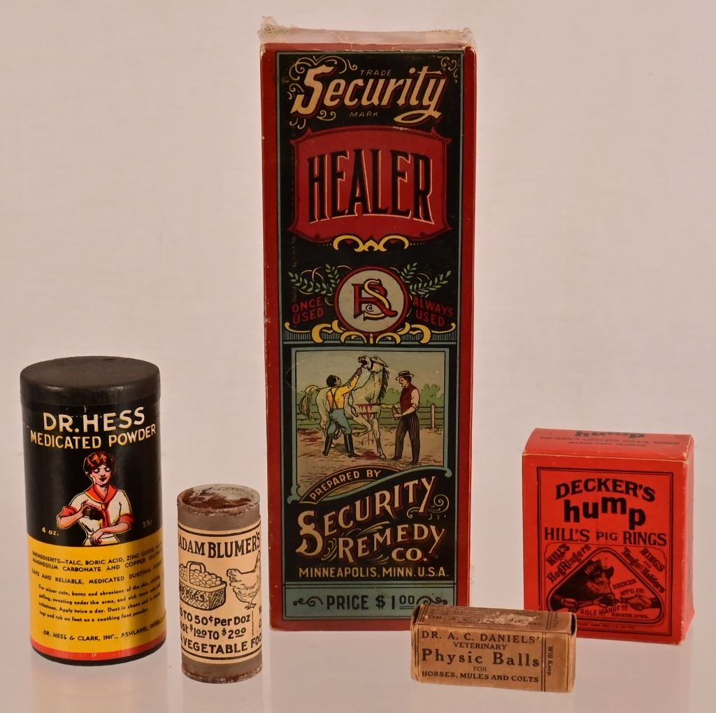 Security Healer for cuts and wounds on cattle, horses or other animals. Dr. Hess Medicated Powder. Madam Blumer's Egg Saver. Dr. A.C. Daniel's Veterinary Physic Balls for Horses' Mules and Colts. Decker's hump Hill's Pig Rings.