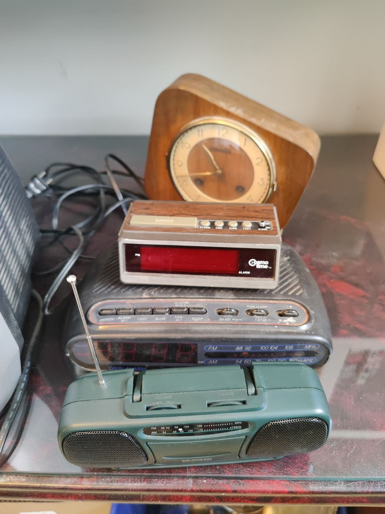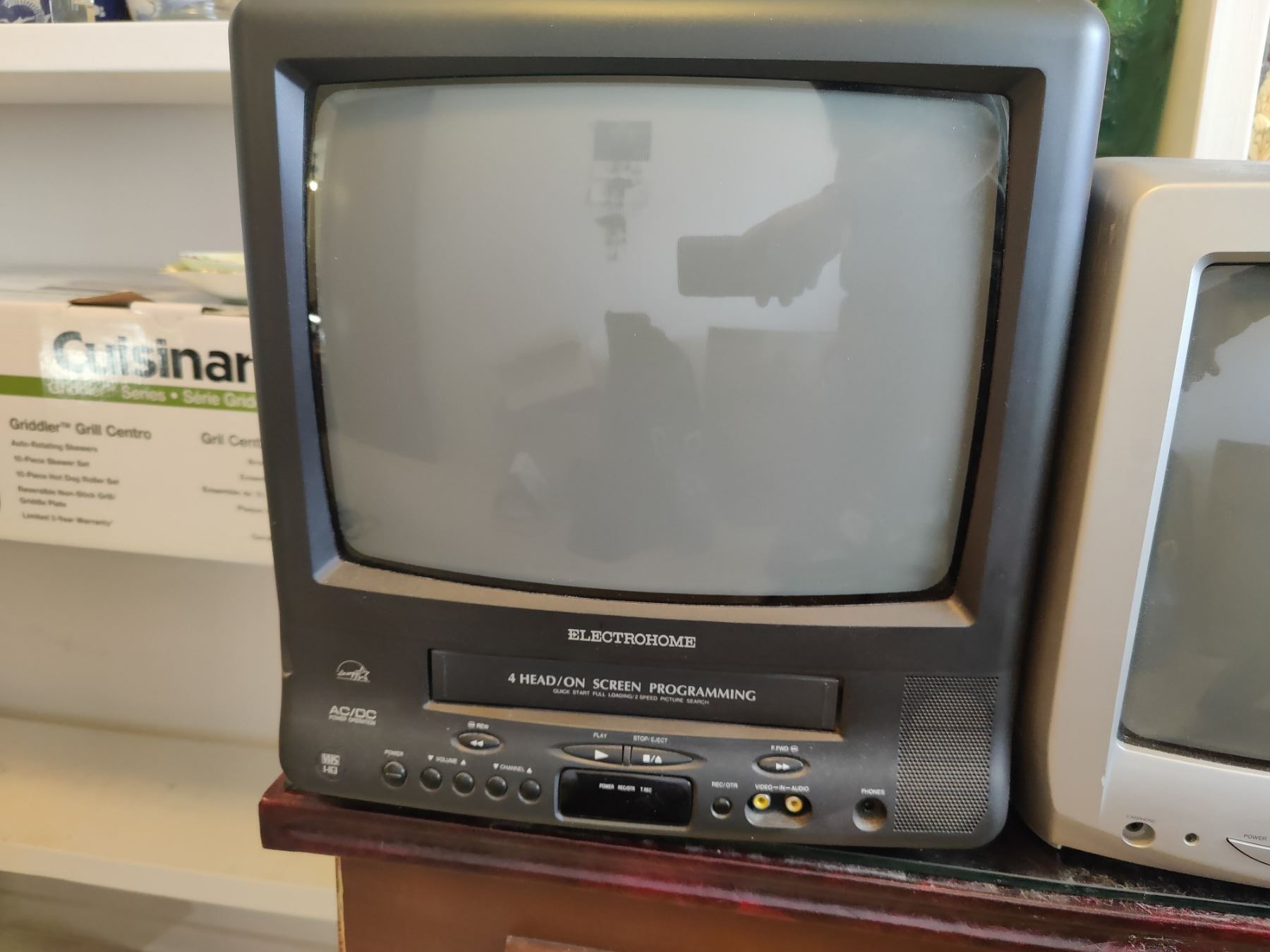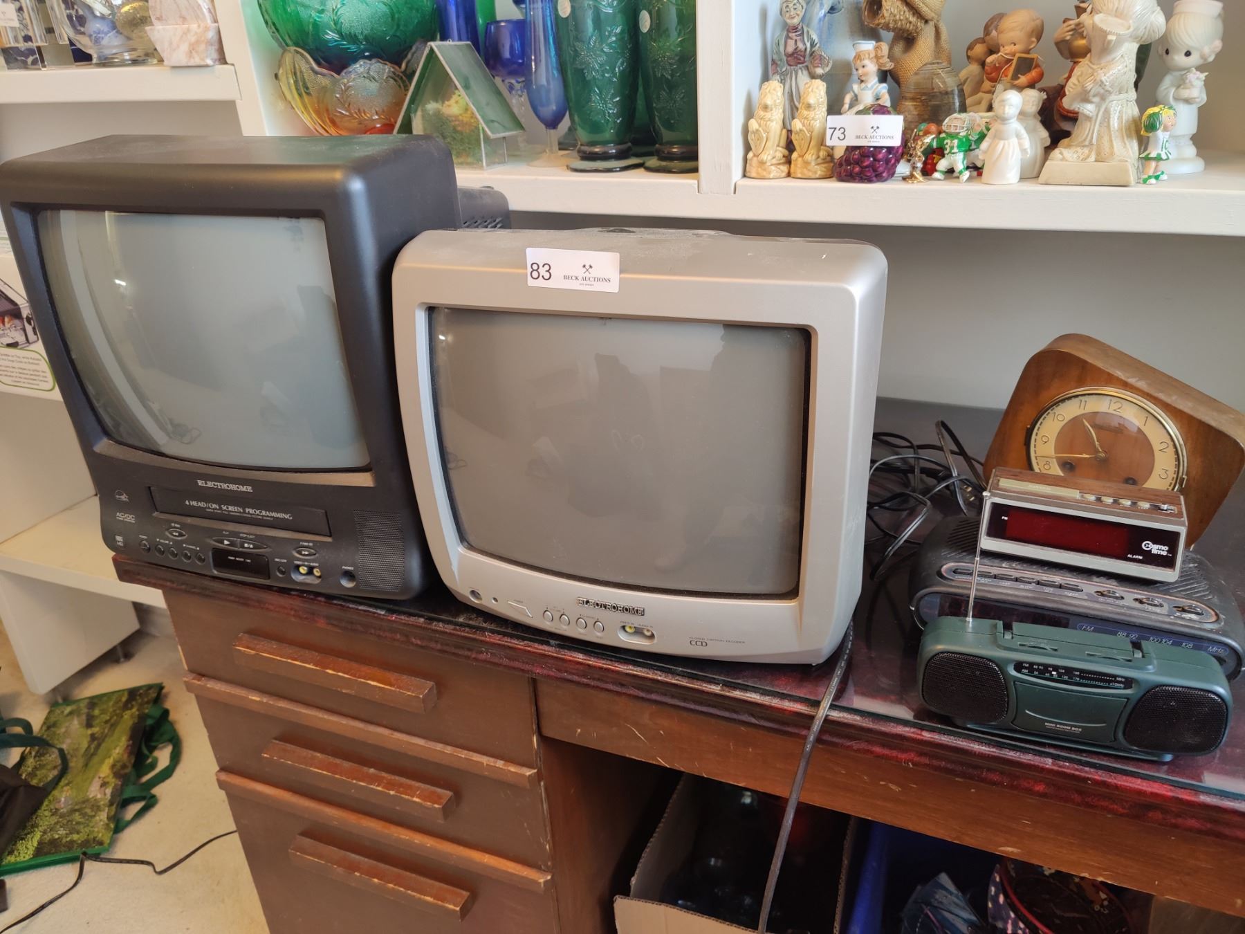 2 Electrohome TVs. One has built in VCR. 3 radios and a clock.