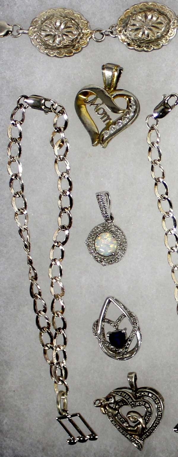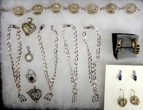 Collection of Rhinestone Jewelry, Most is Sterling Silver, longest is the sterling bracelet measuring 7''L end to end, includes 3 pairs of earrings, 5 bracelets, and 4 pendants