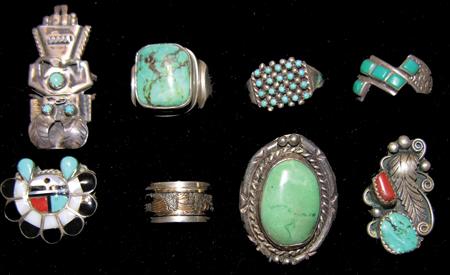 Circa Various, Outstanding collection of eight Zuni and Navajo rings featuring petit point, channel inlay, 14KT gold overlay band, katsina, repousse', and naja. Various