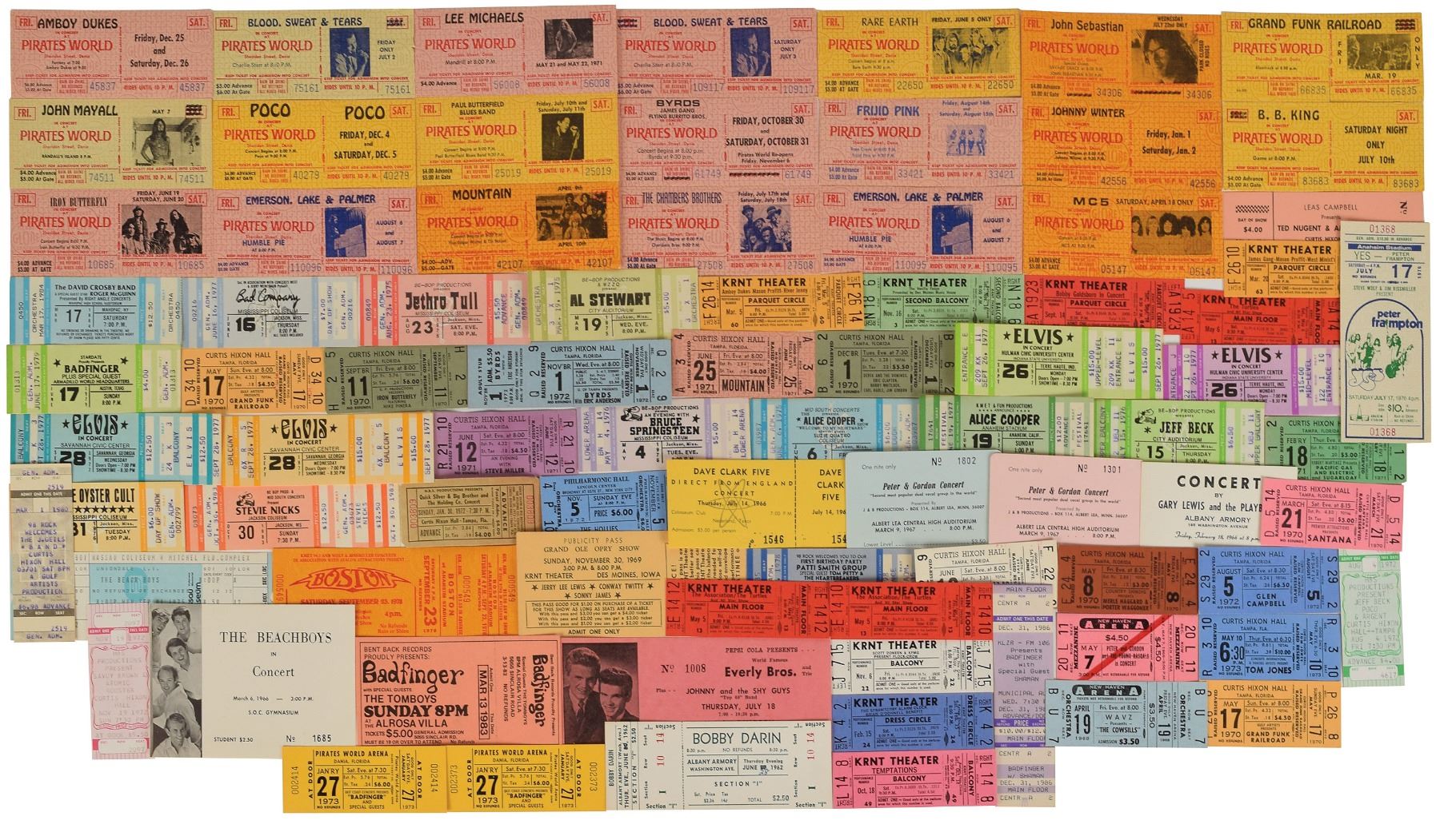 Collection of more than 80 rock concert tickets from venues including Pirates World, Curtis Hixon Hall, KRNT Theater, and others, predominately dated from the 1960s and 1970s, with performers including: Rare Earth; Blood, Sweat & Tears; Paul Butterfield Blues Band; John Mayall; Johnny Winter; B. B. King; MC5; Emerson, Lake & Palmer; Byrds; Jethro Tull; Ted Nugent & Amboy Dukes; Badfinger; Vanilla Fudge; Grand Funk Railroad; Iron Butterfly; Elvis Presley; Steve Miller; Bruce Springsteen; Alice Cooper; Jeff Beck; Derek and the Dominos, with Eric Clapton; Stevie Nicks; Boston; Peter Frampton; The Beach Boys; Patty Smith; Dave Clark Five; Merle Haggard; Glen Campbell; Tom Jones; Peter and Gordon; The Cowsills; and more. In overall fine condition.