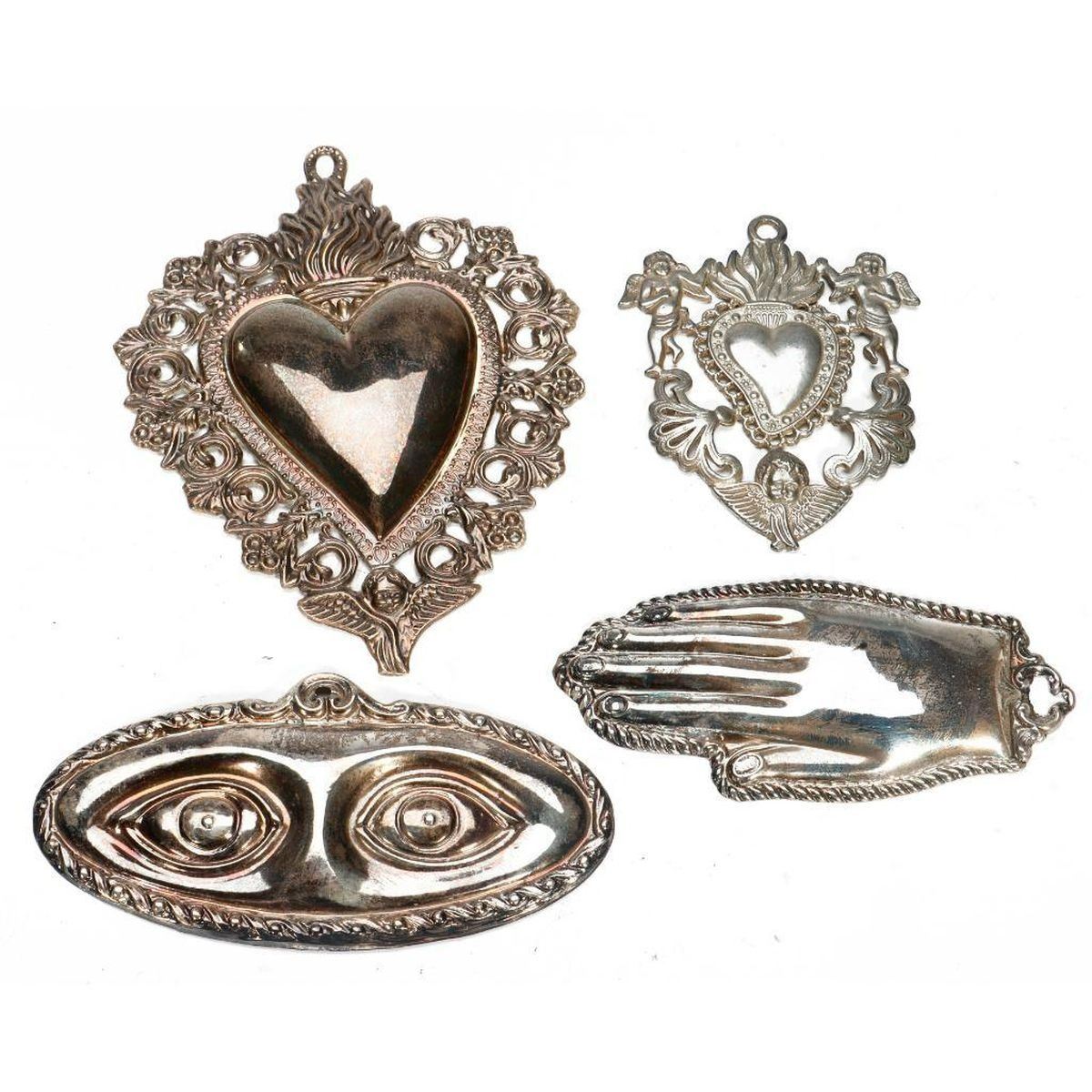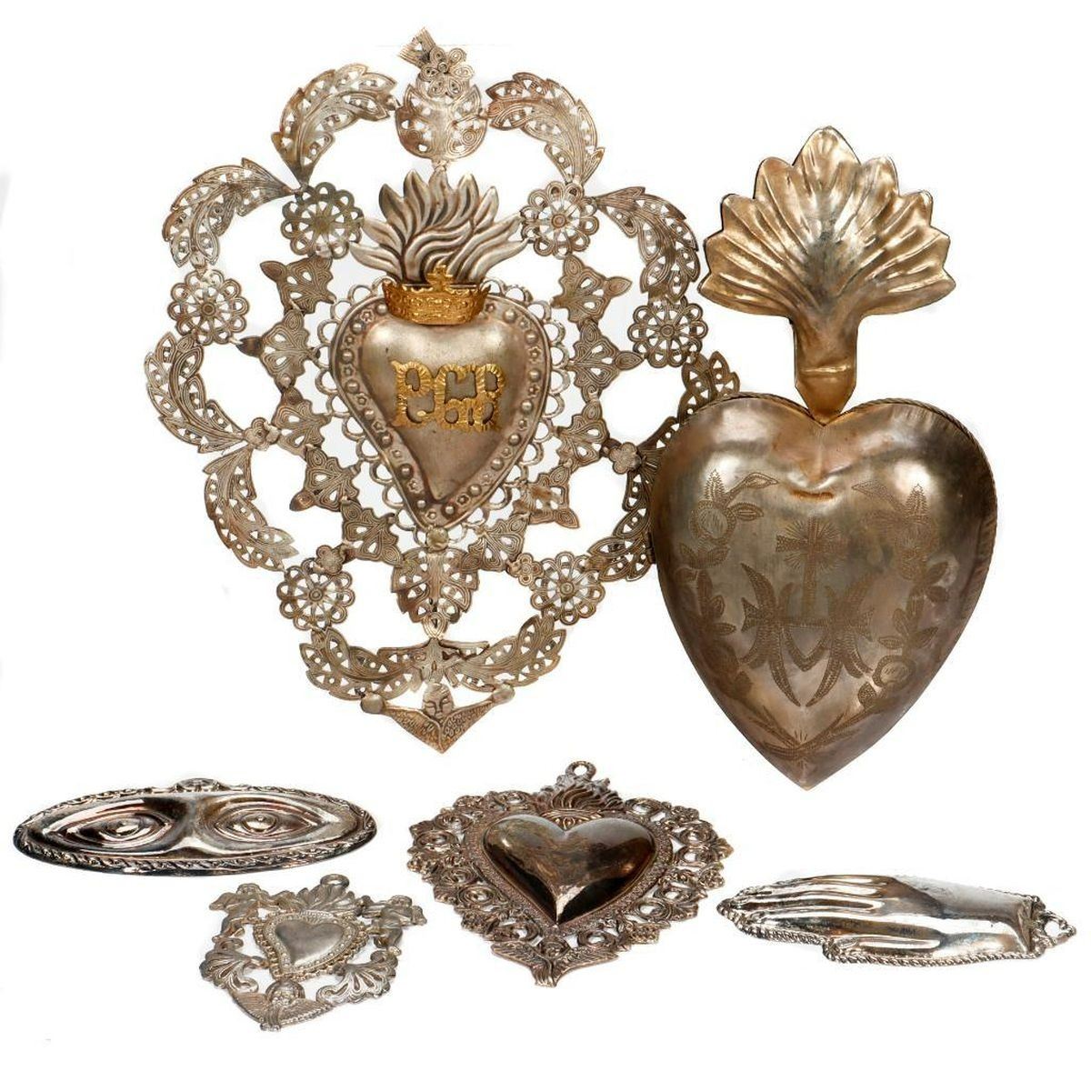 Consisting of a large hinged-front heart, three heart plaques, a hand, and eyes. Ranging from 4in. to 12in. long.