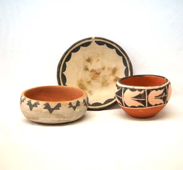Collection of Native American Santo Domingo Pottery Jars, #1 is signed F.T. (Frances P. Torivio). #2 Shallow Bowl unsigned. #3 Small Plate signed Ortiz in pen, has chip in center. largest measures 4.5''W x 1''H