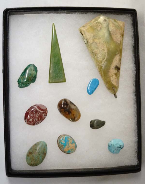 Collection of Semi-Precious Gemstones, largest measures 3'' x 3.5'', includes jade, turquoise, agate, and malachite