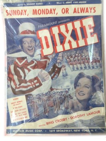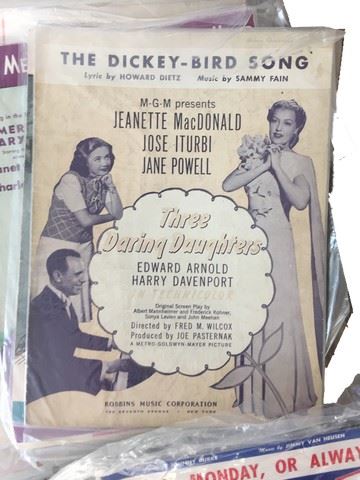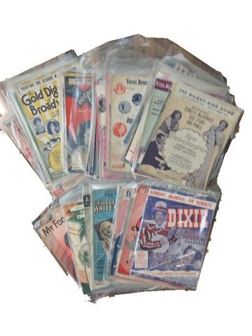 Collection of sheet music and musicals ~50 from a large span of time. This is an amazing collection for any music lover, just a few of the many sheets in this large collection include, "Dixie" starring Bing Crosby and Dorothy Lamour, "It's A Great Life" starring the Duncan Sister's, "With My Eyes Wide Open I'm Dreaming" music and lyrics by Mack Gordon and Harry Revel, "I'm Glad I Waited For You", lyrics by Sammy Cahn and music by Julie Styne", "Love Somebody" by Joan Whitney and Alex Kramer, "Wish You Were Here" music and lyrics by Harold Rome, and "Darling Lili" lyrics by Johnny Mercer, music by Henry Mancini.