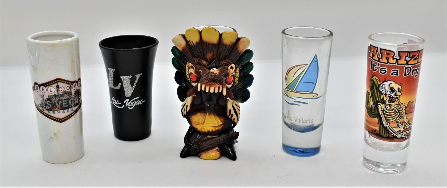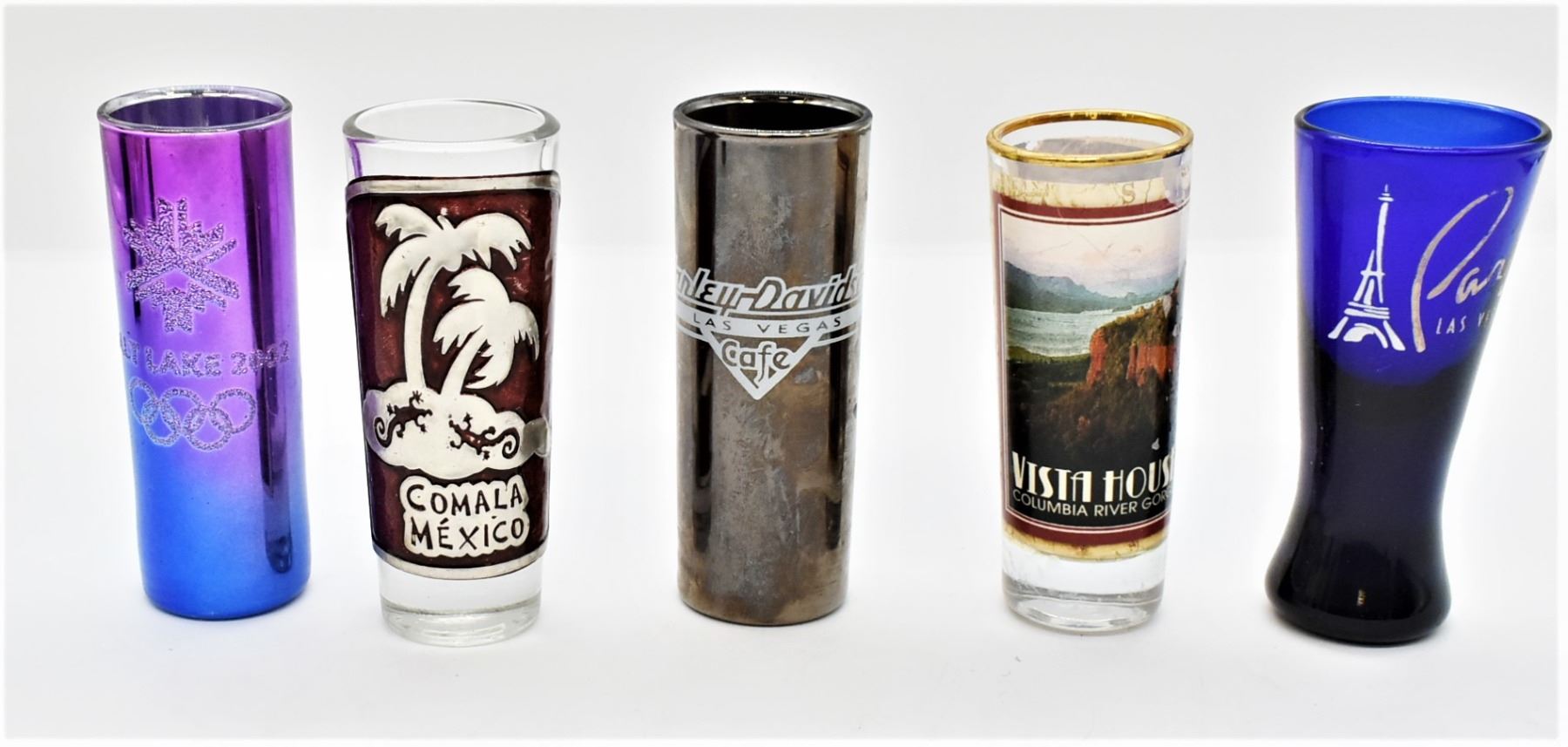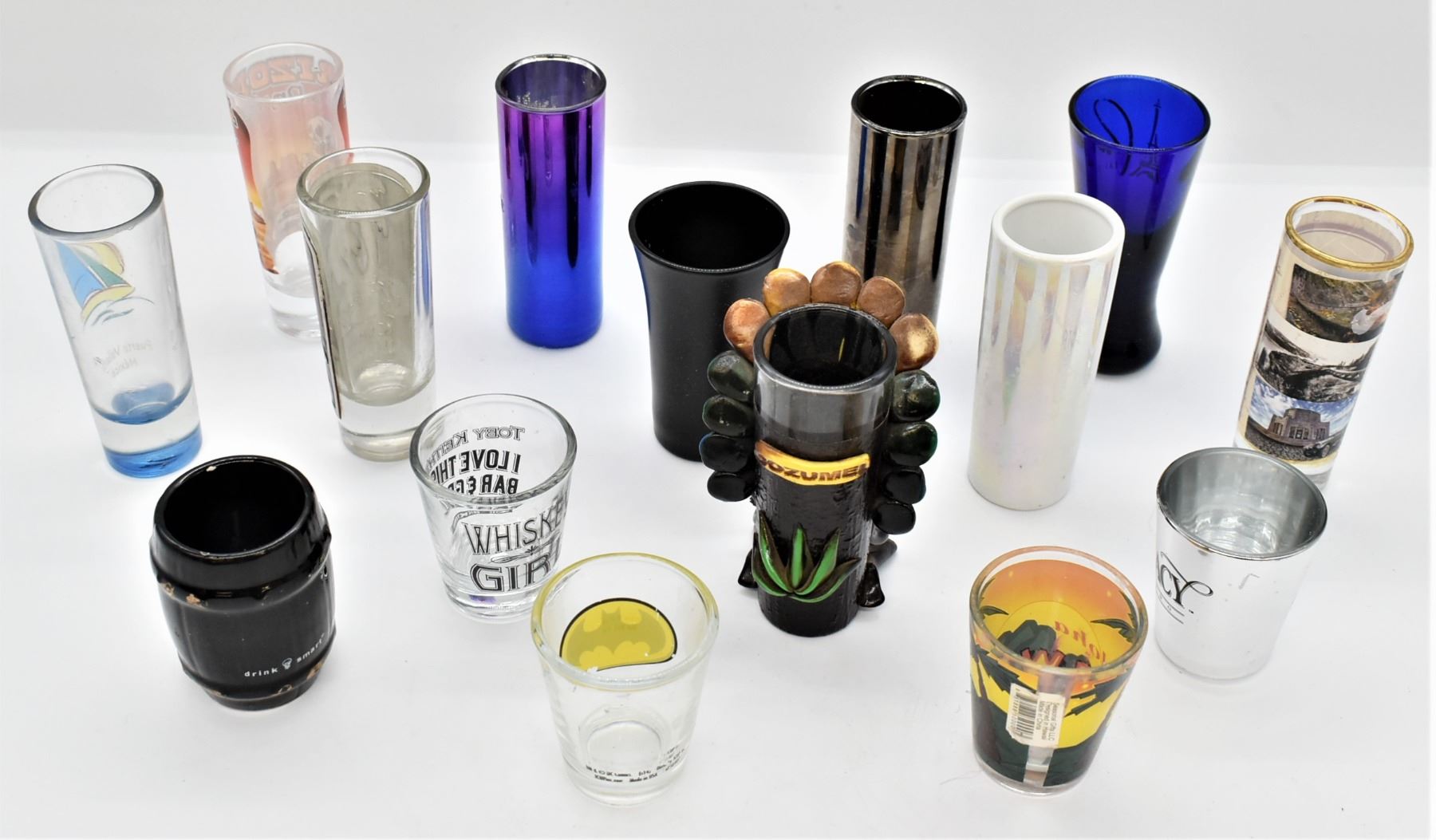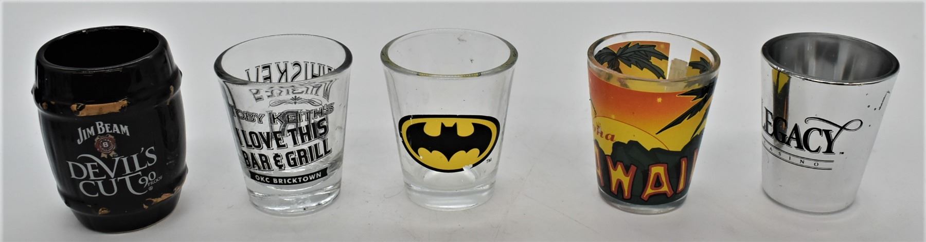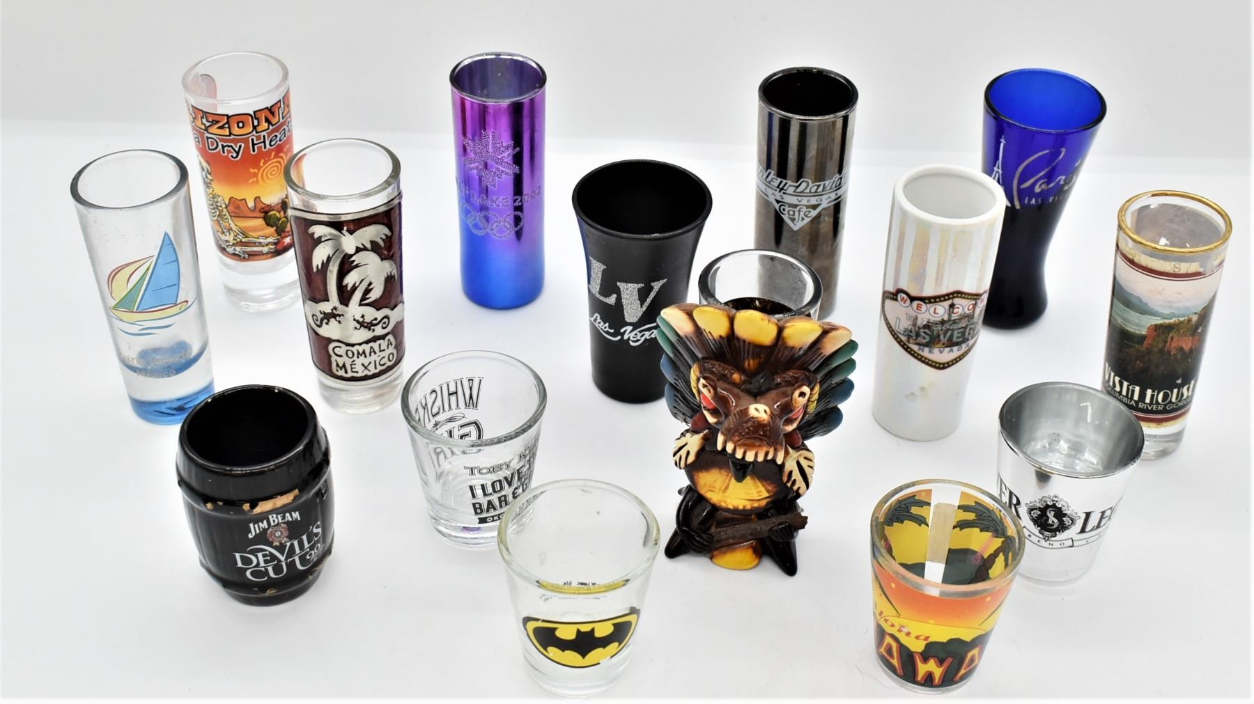 Collection of Shot Glasses, includes 1. Cozumel Souvenir Tall Shot Glass, largest measuring 4.5''H 2. Las Vegas Souvenir Tall Shot Glass 3. Las Vegas Tall Shot Glass 4. Arizona Tall Shot Glass 5. Puerto Vallarta Tall Shot Glass 6. Columbia River Gorge Vista House Tall Shot Glass 7. Comala Mexico Tall Shot Glass 8. Salt Lake City Olympic Tall Shot Glass 9. Las Vegas Paris Tall Shot Glass 10. Las Vegas Harley Davidson Cafe Tall Shot Glass 11. Hawaii Shot Glass 12. Batman Shot Glass 13. Toby Keith Whiskey Girl I Love This Bar and Grill OKC Bricktown Shot Glass 14. Jim Beam Devil's Cut 90 Proof Barrel Shaped Shot Glass, some gold gilt paint loss 15. Silver Legacy Resort Casino Reno NV Shot Glass