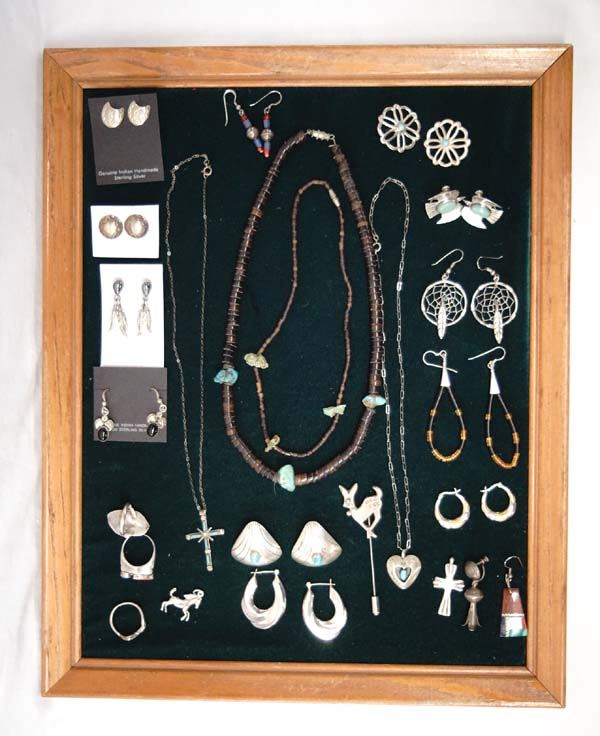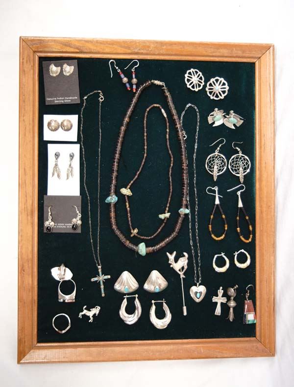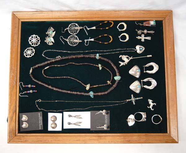 Collection of Silver Jewelry, Some Native American, includes 3 rings, 4 necklaces, 1 pin, 13 pairs of earrings, 2 pendants, and 2 single earrings, nice collection with lots of variety, multi-stone