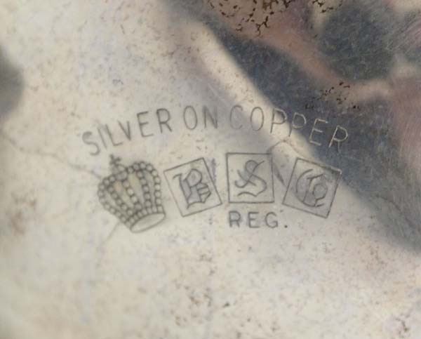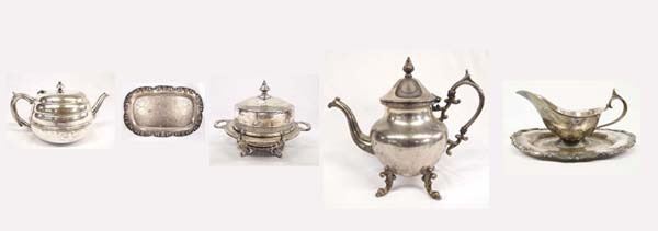 Collection fof Silver Plate Items #1 Antique Victorian-era quadruple silver plate chased dome cover footed butter dish in a floral and rope motif by Pairpoint Mfg. Co. New Bedford, Mass., measures 6'' x 6'', hallmarked. #2 Antique Birmingham Silver Co. Silver on Copper Teapot, measures 9.5''H x 11.5''W, hallmarked #3 Antique Deakin Silverplate Teapot, measures 9''L x 6''D, hallmarked #4 Antique 1883 FB Rogers Silver Plate Gravy Boat with Attached Spill Tray, measures 9.5''L x 3.75''H x 6''W, hallmarked, #6006 #5 Marlboro Electroplate on Copper Old English Replica Plate, #1659, measures 6'' x 9.5'', hallmarked, with repousse' grapes along edge.