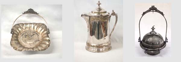 #1 Vintage 1950-1960 Columbia Silver Co. Quadruple Silverplate Dish, dish measures 8'' x 8'' with handle, FYI: Columbia Silver Co. Brooklyn, NY 1957-1961, 4 legs, ornate etching in bowl, bowl is stamped. #2 Reed and Barton Victoriana Cold Beverage Silver Pitcher, measures 14'' x 11.5'', ''Magnificent Antique Victorian cold beverage silverplated pitcher. This fantastic pitcher features highly decorated hand-engraved and hand-chased floral accents all over, from the centerpiece, to the spout, to the handle and finial. It was made by Reed & Barton and stamped Patented Aug 4, 1868 to May 1879. Also incribed 1860 on the base.'' #3 Antique Middletown Plate Co. Covered Butter or Cheese Dish, measures 11.5''H x 7.5''W, does not come with butter knife, hallmarked on bottom, quadruple plate