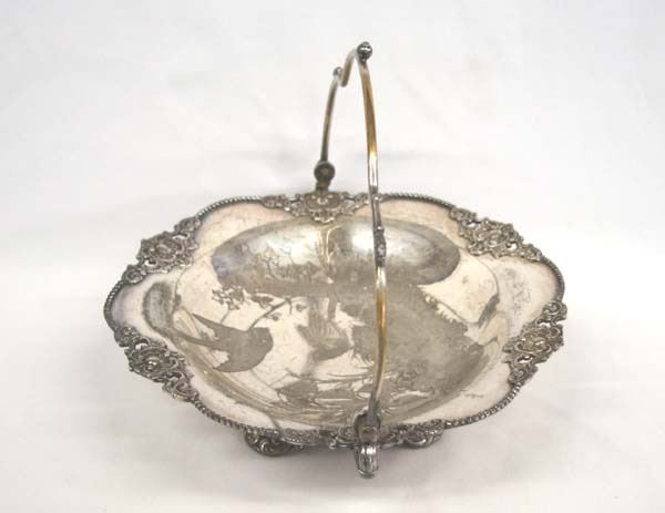 Collection of Silver Plated Items #1 2 Pairs of Antique Silverplate Empire Style Salt & Peppers by Benedict-Proctor Mfg. Co., measure 2''W x 6.5''H, FYI: Benedict-Proctor Mfg. Co. founded in 1910 as a branch of Benedict Mfg. Trenton, Ontario Canada #2 Antique Taunton Silverplate Egyptian Revival Mask Pattern Coffee Pot, Pharaoh Finial and Death Mask Feet, hallmarked, tripleplate, measures 10.75''H x 8.5'' from handle to spout and 6.5''D #3 Lovely old four footed coffee pot in Wallace Silversmiths ''Baroque'' pattern. Hinged lid coffee pot is 5 1/2 inches diameter, 11 inches high, 11 inches handle to spout. Marked ''Baroque by Wallace 282'' on the bottom. #4 Meriden Victorian Art Nouveau Silverplate Footed Brides Basket, measures 3''H x 10''D, hallmarked, quadruple plate, #6754 Patented December 29, 1895, piece missing off of handle