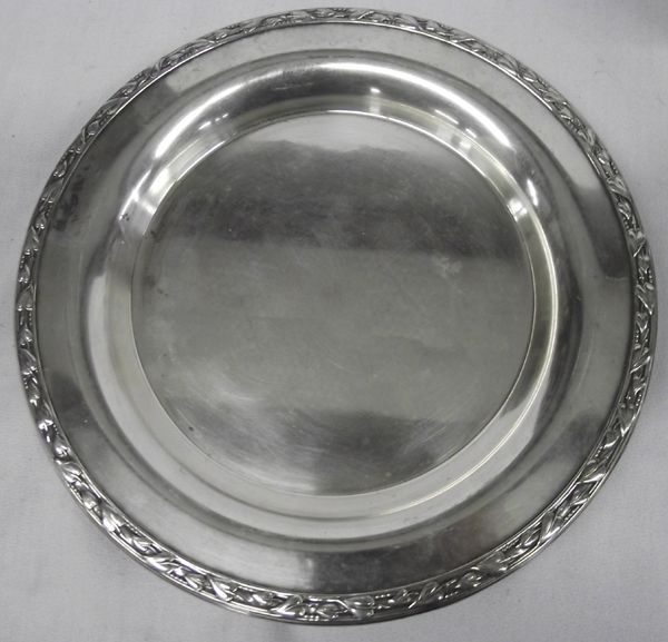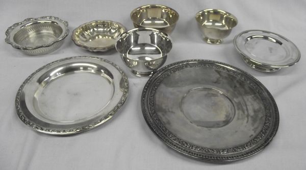 Collection of Silver Plated Serving Pieces. 1) Plate measures 10'' diameter, Reed and Barton 1201. 2) Plate 9'' Wm A. Rogers Meadowbrook. 3)Bowl EPCA Old English by Poole 5042, cut out sides. 4) Oneida Ltd. candy dish. 5) Oneida USA small candy tray 6) 2- Gorham EP YC778 bowls and one-Gorham EP YC795. From Proctor Collection, Silver City, New Mexico.
