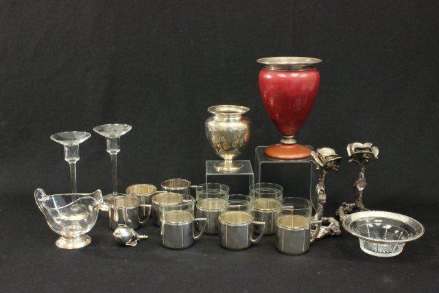 Including 9 cup holders, 5 with inserts; bronze and sterling vase approx. 8 1/4" H; pair of silver clad floral candlesticks approx. 7" H, creamer with sterling silver base, sterling silver vase approx. 5 1/4" H, pair of candlesticks with sterling silver bases, silver clad fruit and candy dish with silver rim. 18 total. From a NYC collector's 40 year compilation.