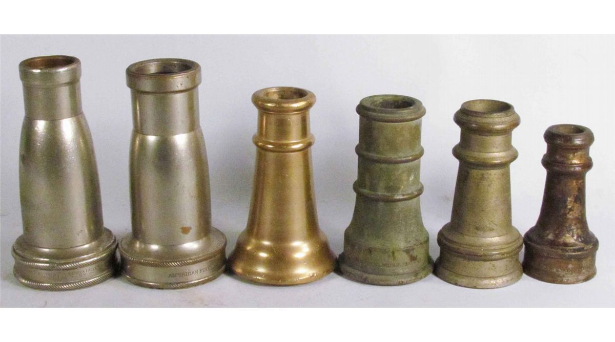 Collection of Six Brass Fire Nozzle Tips. Five tips nickel plated. Sizes up to 6 inches tall.