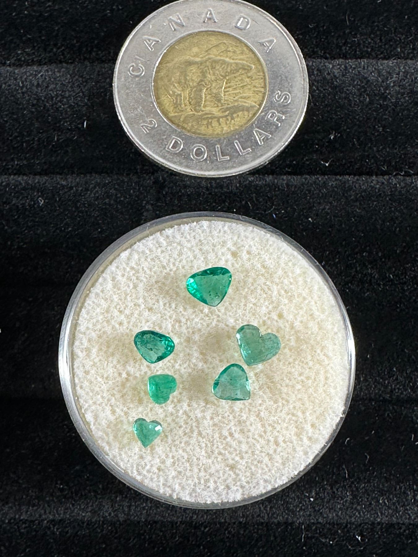 Charming group of six natural emerald gemstones, each cut in a heart shape with a bright, saturated green tone. Natural inclusions add authenticity. Condition: Excellent overall, polished and ready for setting.