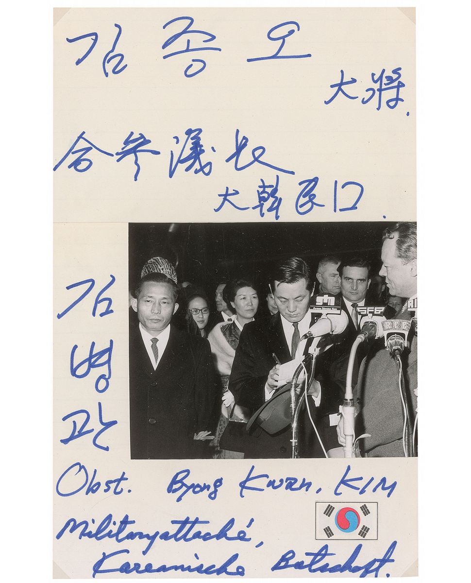 Collection of six felt tip signatures of South Korean leaders on slips and cards of various sizes, signed during their visit to Germany in December 1964, including: Park Chung-hee (president and military general); Tong Wong Lee (minister of foreign affairs); S. E. Kurta; C. H. Park (trade minister); Byong Kwan Kim (military attache); and Kim Ching oh. Affixed to larger sheets with images of the leaders visiting the Berlin Wall. In overall fine condition, with light soiling to one side of the Park Chung-hee signature. The South Korean delegation went on a four-day state visit to Germany in December 1964 to learn about the nation’s economic development, visiting the Berlin Wall on December 11.