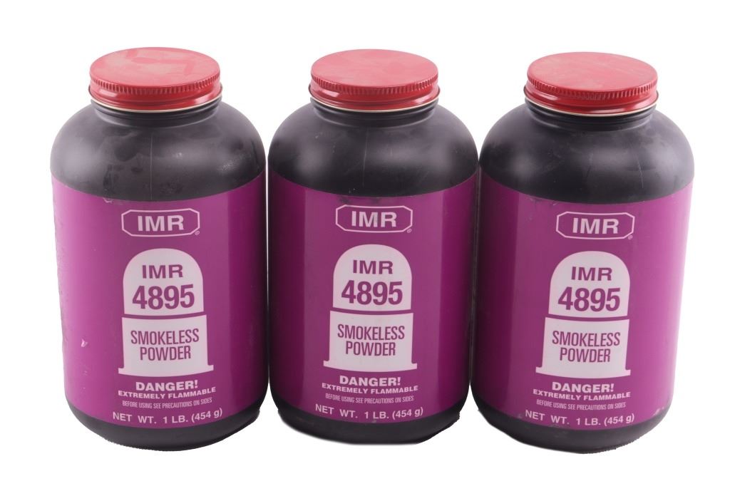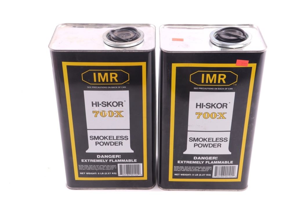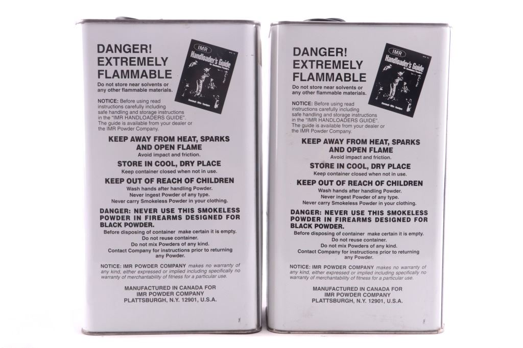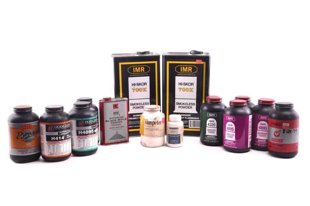 Featured in this lot is this collection of smokeless black powder and saltpeter. There are two large canisters of black powder and nine smaller sized cylindrical containers with two smaller canisters of saltpeter. The condition of this collection of black powder and saltpeter is good, with no obvious signs of damage. The measurements of these cans of smokeless powder are 12" x 6 3/4" x 4 1/4" for the larger cans, 6 1/4" x 3 3/4" x 1 3/4" for the second smallest can, 6 1/4"3 1/4" x 3 1/4" and for the smallest container 4 1/4" x 2" x 2".