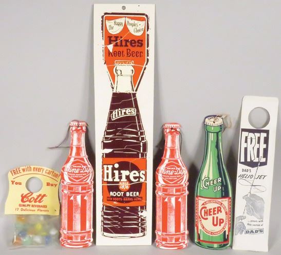 Collection of Soda Advertising Items. Coke bottle hanger with bag of marbles, (2) Wine Dip String Hangers, Dad's Helio Jet toy, Cheer Up String Hanger and Hires Root Beer Decal measures 3 X 14 inches.