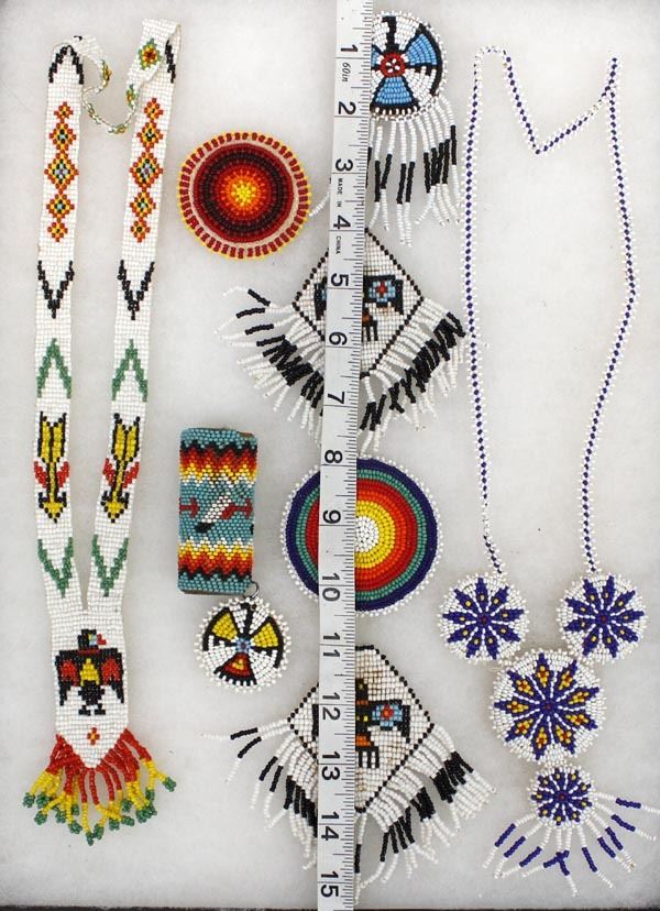 Collection of Southwestern Beadwork, to include Necklaces, Lighter Cover, Pins, Amulets,& Rosettes.Longest Necklace is 24'' End to End.