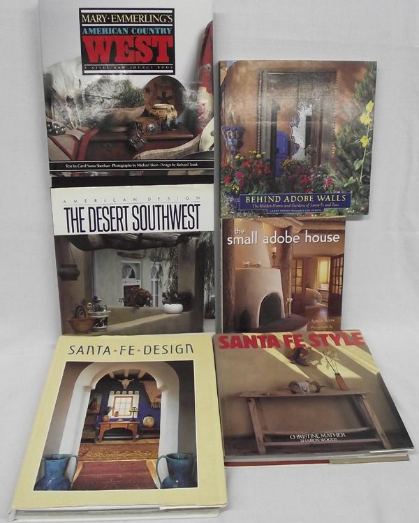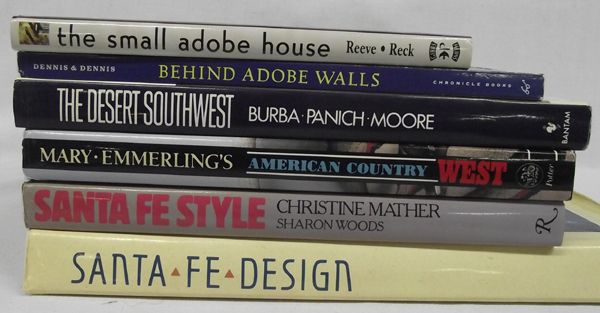 Collection of Southwestern Design Books. There are 6 Books included in this collection. 5 hard covered and one Paper bound. They include a range of design ideas covering adobe, Desert, and Santa Fe designs and decor. Authors include, Nora Burba & Paula Panich, Christine Mather & Sharon Woods, Agnesa Reeve, Carol Sama Sheehan, Landt Dennis. Largest book measures approx. 1'' x12.5'' x 9.5''.