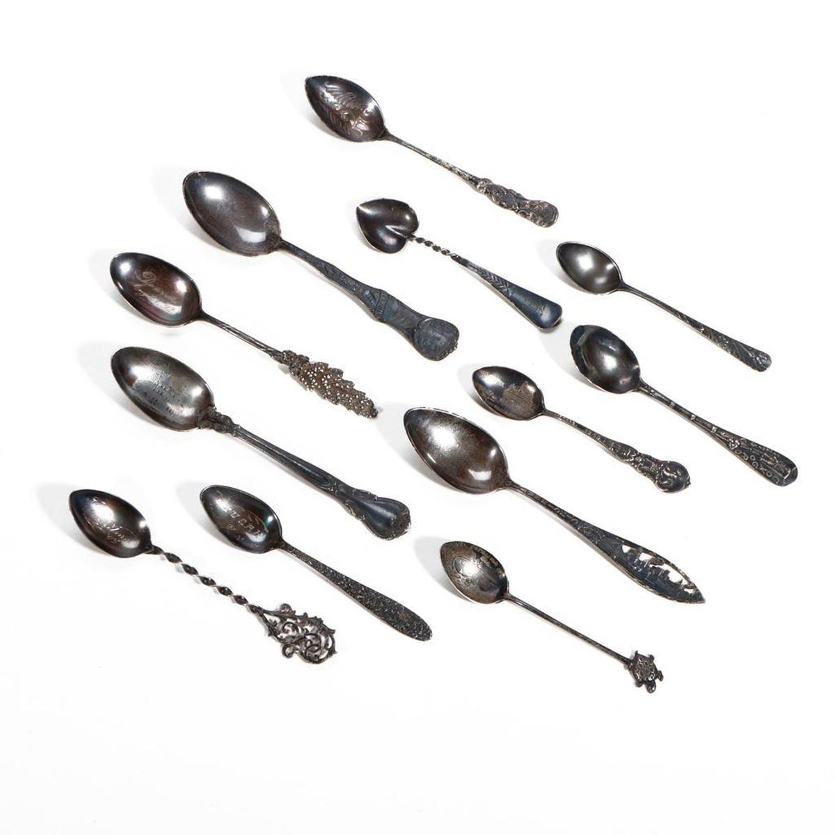 12 sterling teaspoons, late 19th to mid-20th century. A couple related to the Ralph DuCasse family; one with Harriet Dean's monogram. Locations including Cincinnati, Paducah, Carolina, San Francisco, Catalina Island. Approx. 153 grams. From the Family of Xavier Martinez (1869-1943), Elsie Whitaker Martinez (1890-1984), and Micaela Martinez DuCasse (1913-1989).