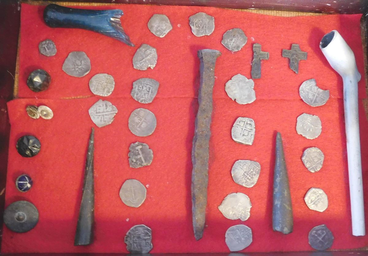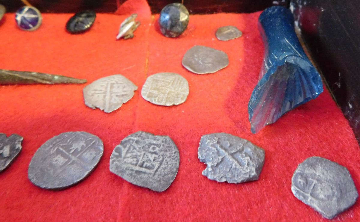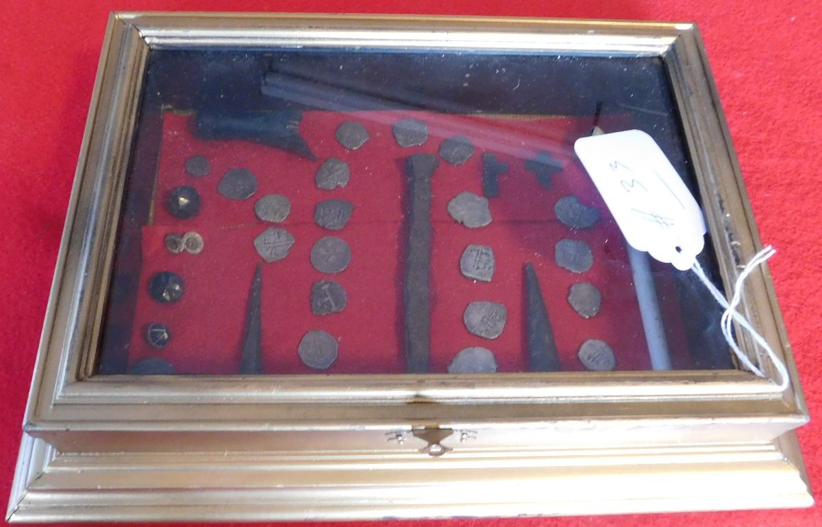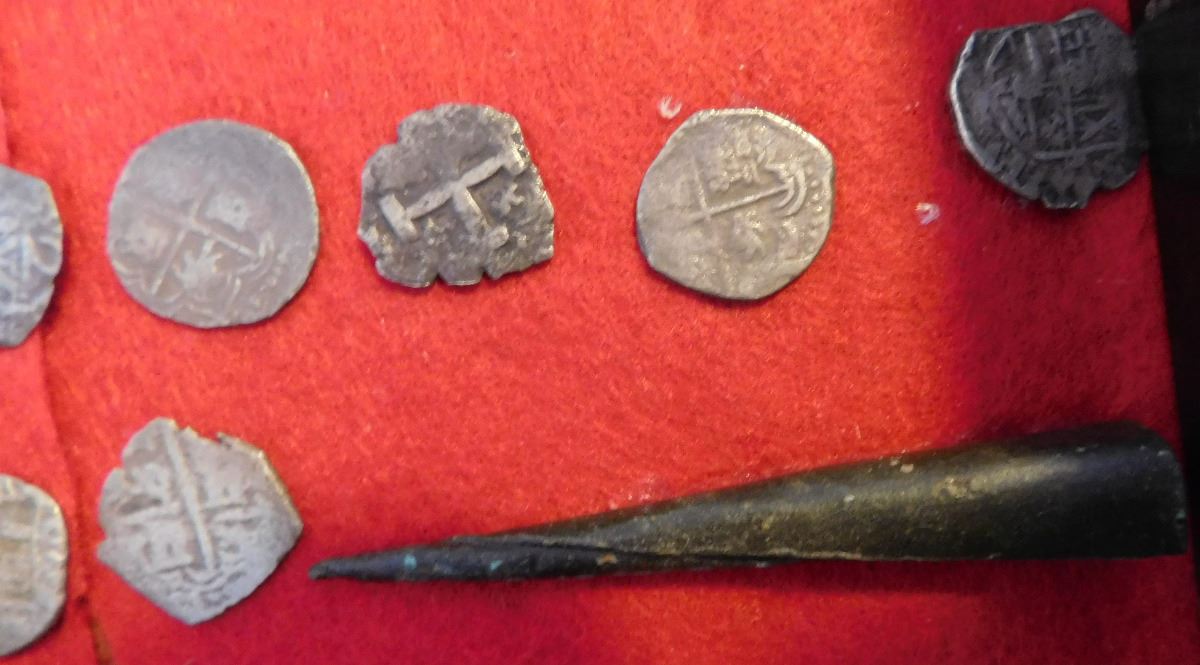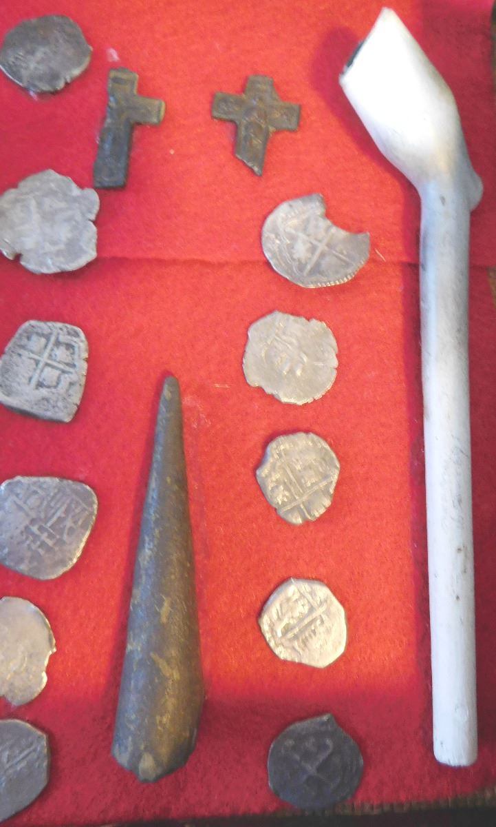Collection of Spanish Pirate Treasure items from the 1600's to 1700's. The items are a clay pipe measuring six inches; Iron spike measuring 5 inches; Iron arrow points measuring 3 inches, broken bottle measuring 3 inches and silver cobbs from 1/2 to 1 inch. These items were found in a beach area in Veracruz, Mexico. There are 23 early silver Spanish Cobb coins all authentic. Condition: All items are found as is, see images. Shipping: $28.00
