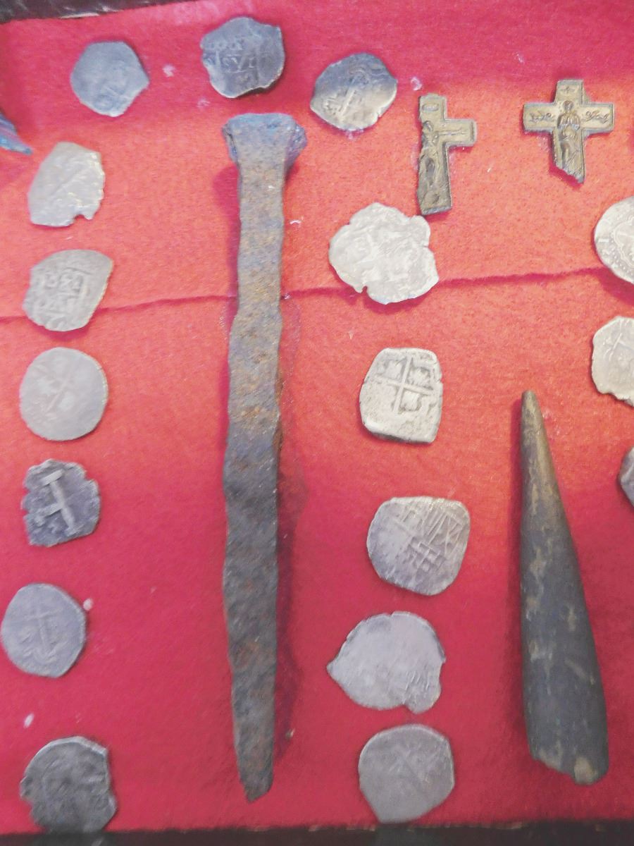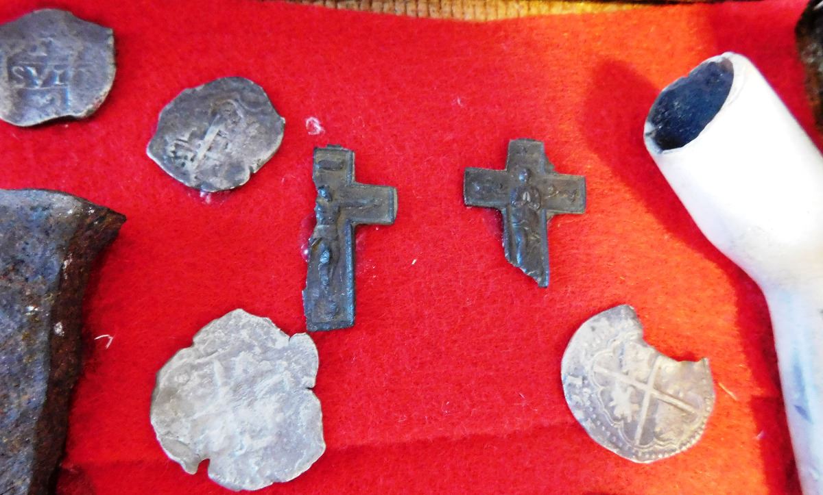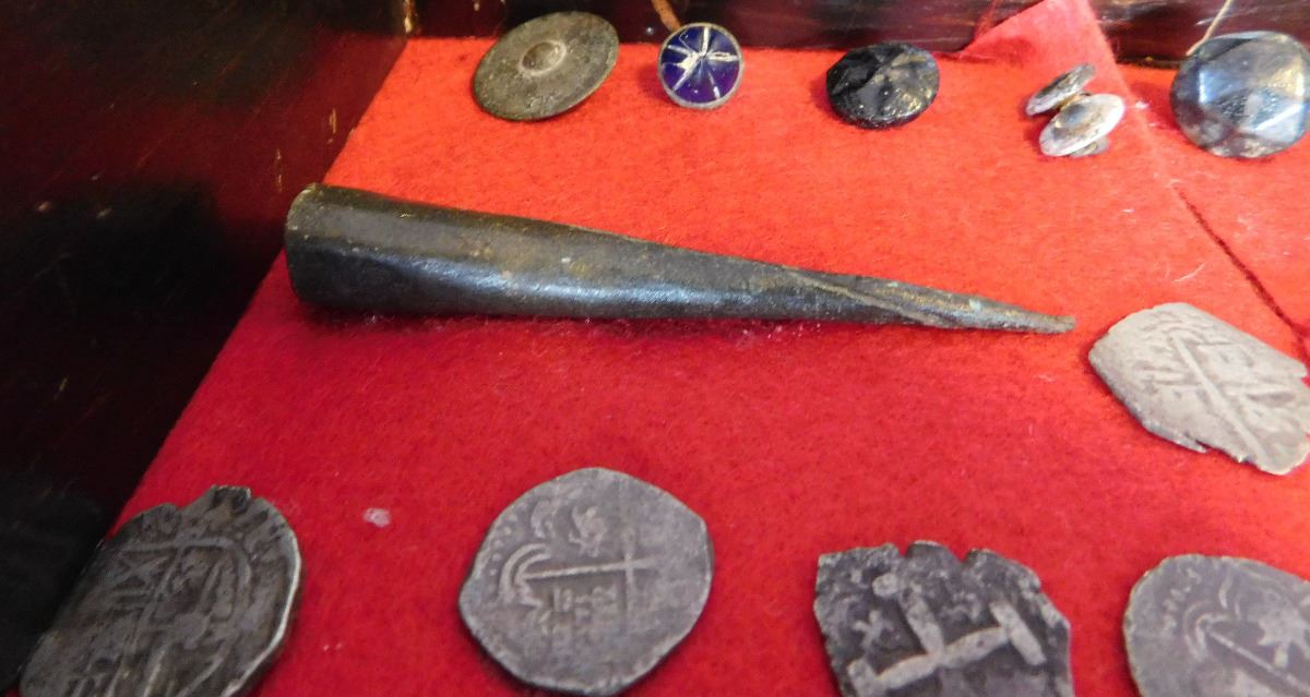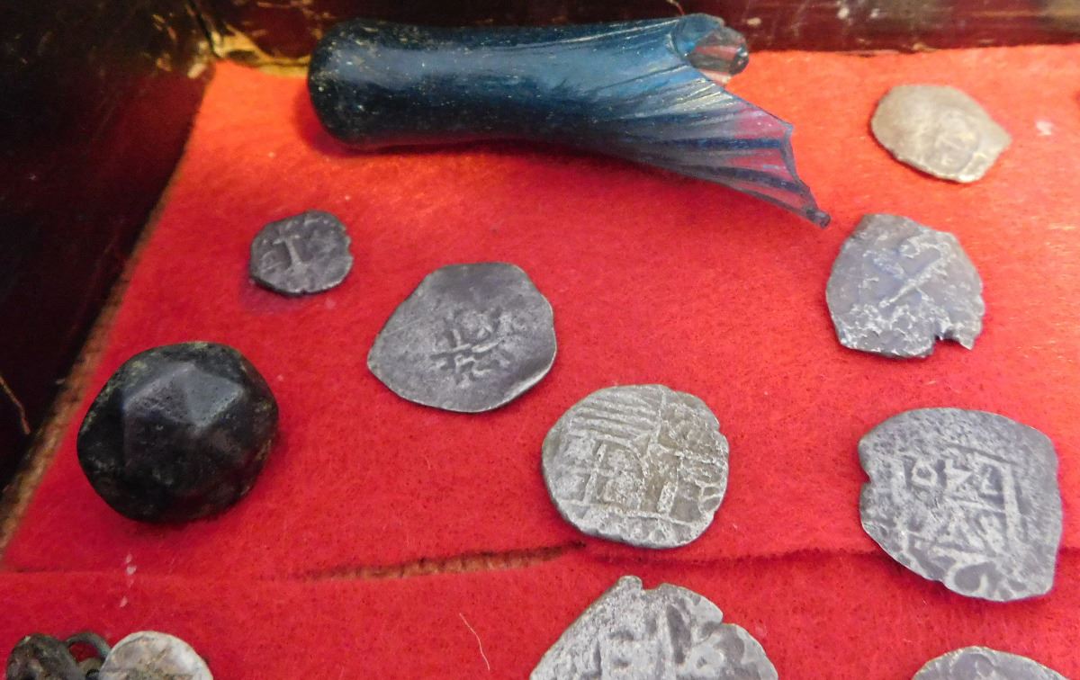 Collection of Spanish Pirate Treasure items from the 1600's to 1700's. The items are a clay pipe measuring six inches; Iron spike measuring 5 inches; Iron arrow points measuring 3 inches, broken bottle measuring 3 inches and silver cobbs from 1/2 to 1 inch. These items were found in a beach area in Veracruz, Mexico. There are 23 early silver Spanish Cobb coins all authentic. Condition: All items are found as is, see images. Shipping: $28.00
