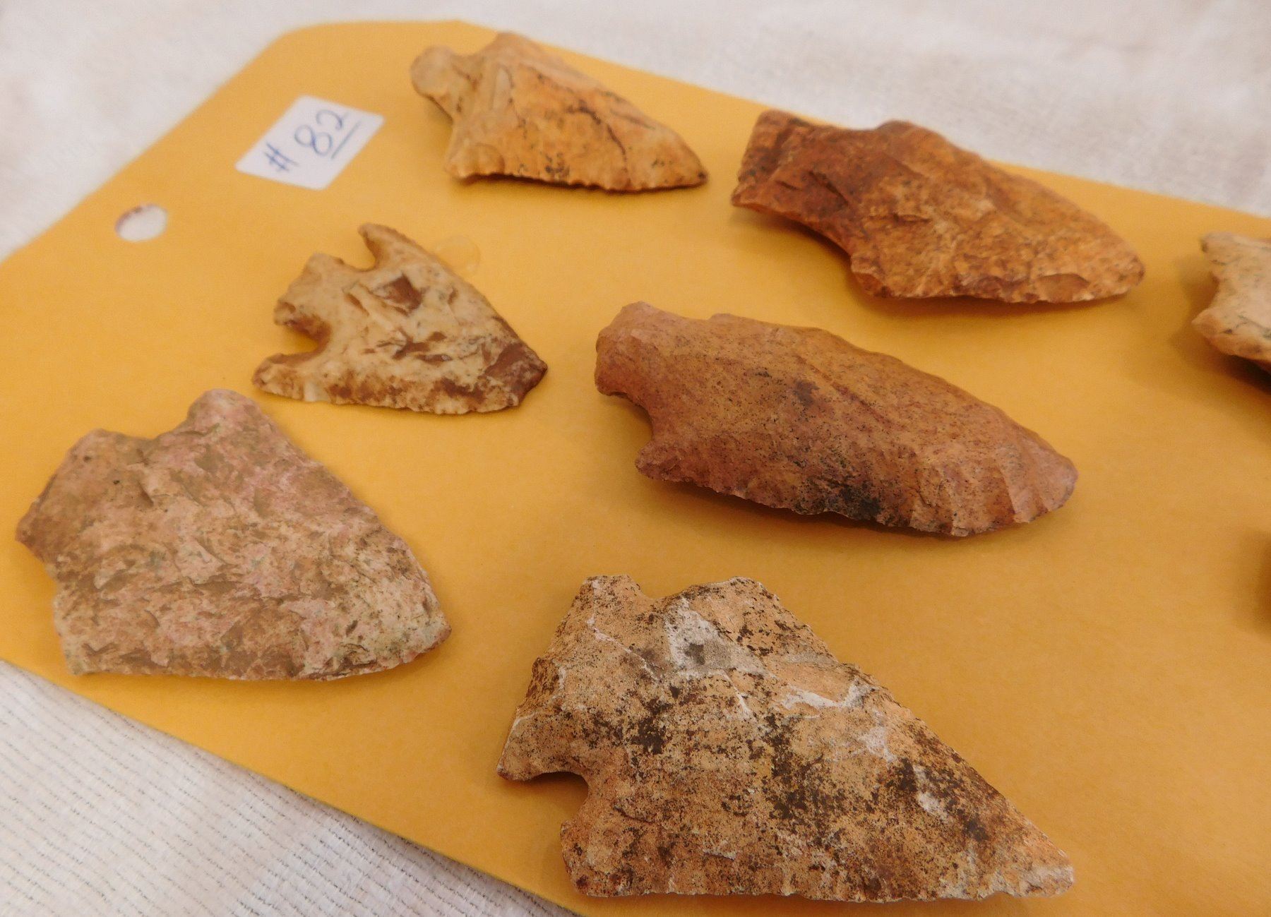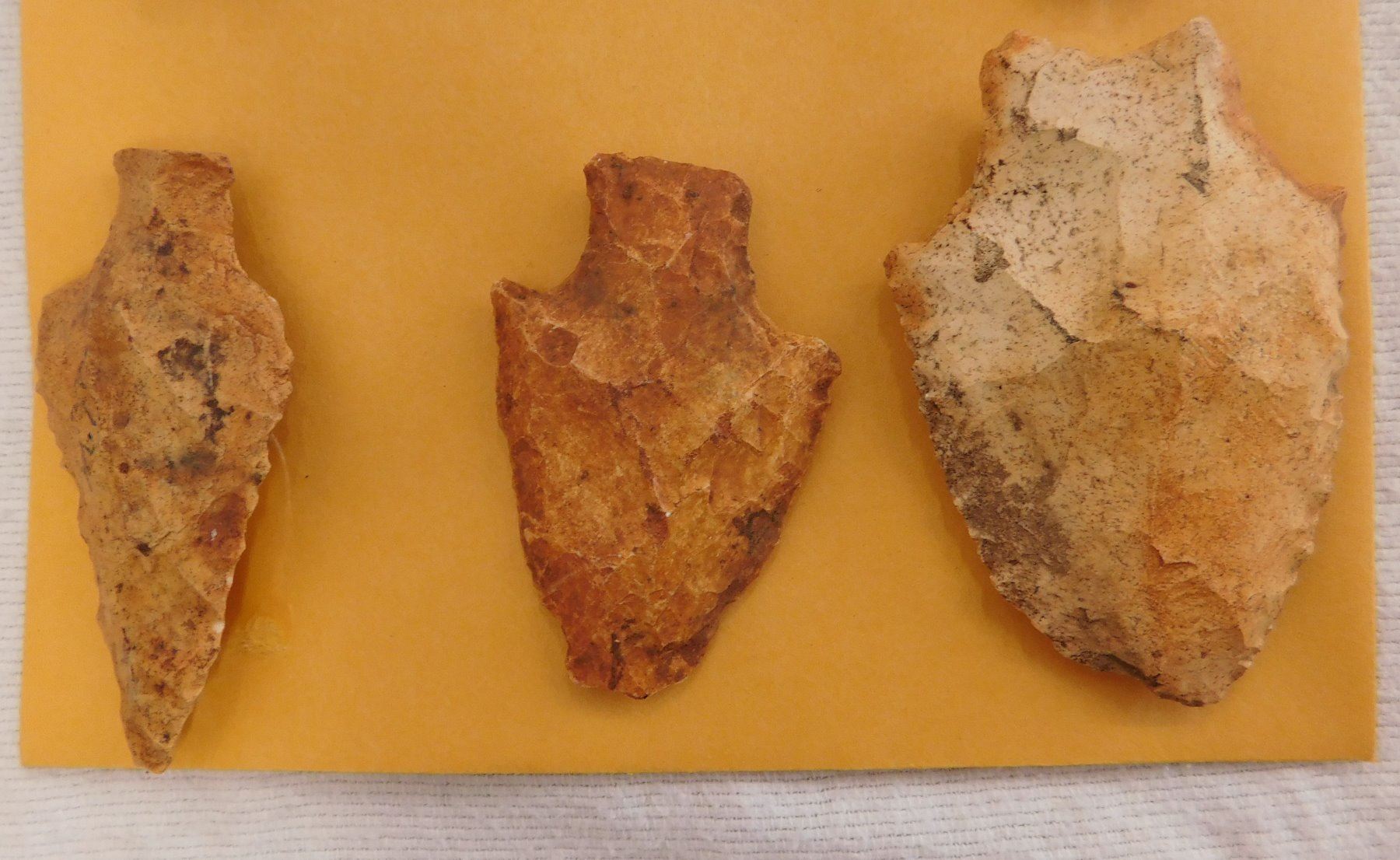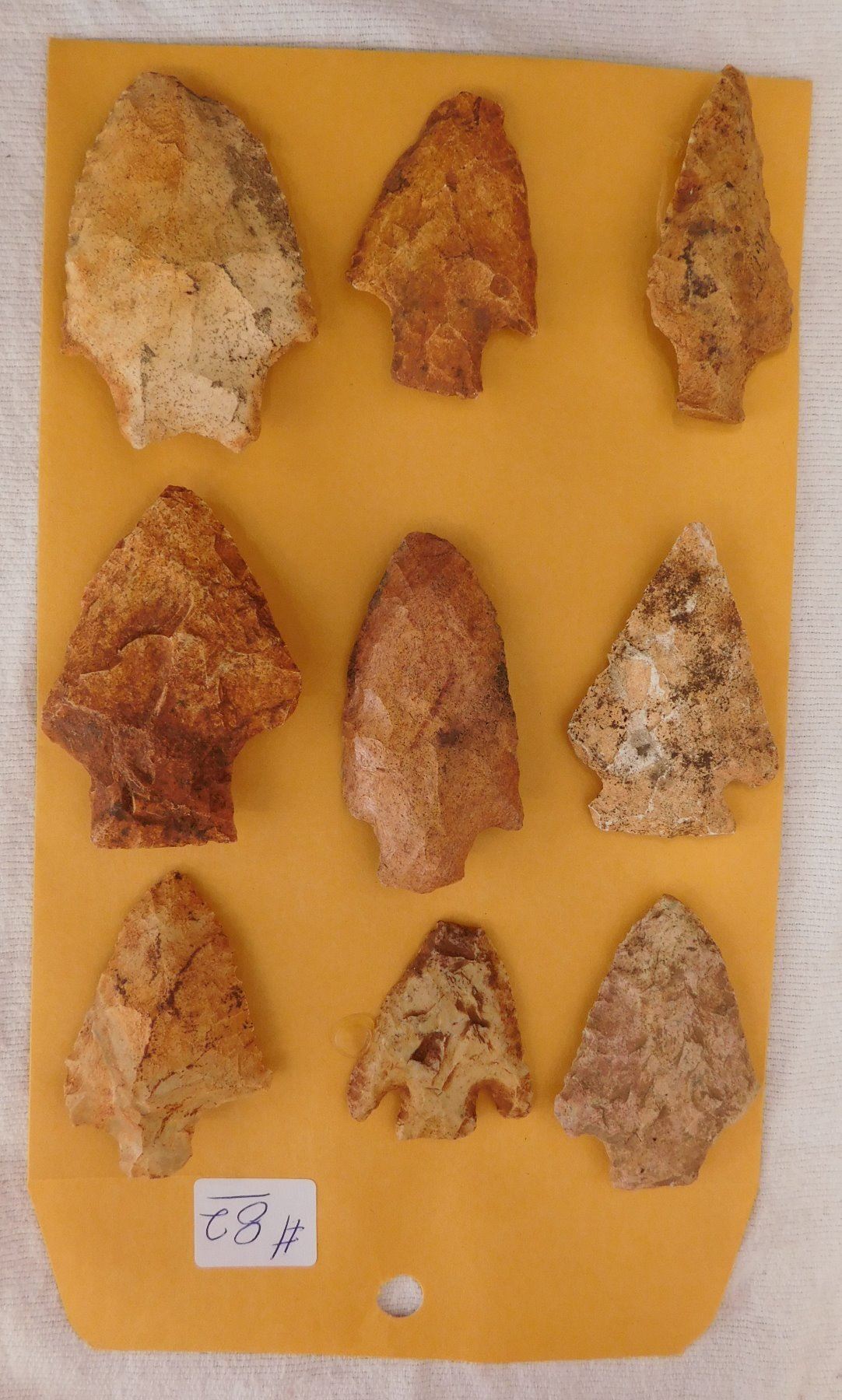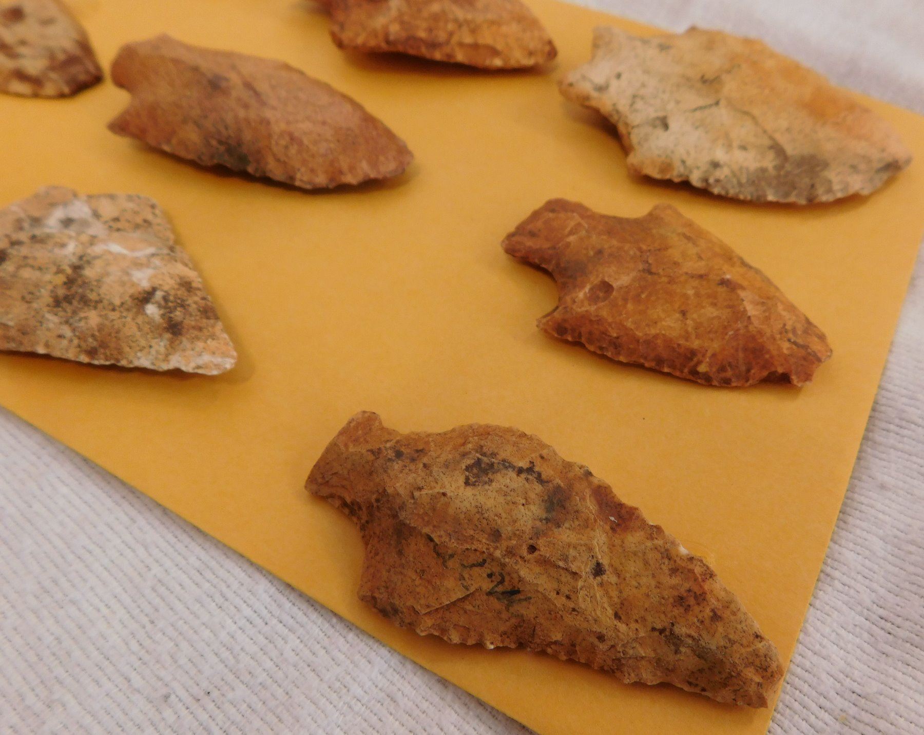 Collection of Spearheads, circa 5000 years old. Made of chert, the items measure from 1.5" to 3". Terrell County, Georgia. Heavy patina, found in the 1940s. Condition: As found, some chips, see images. Shipping: $14.50 w/insurance and signature.