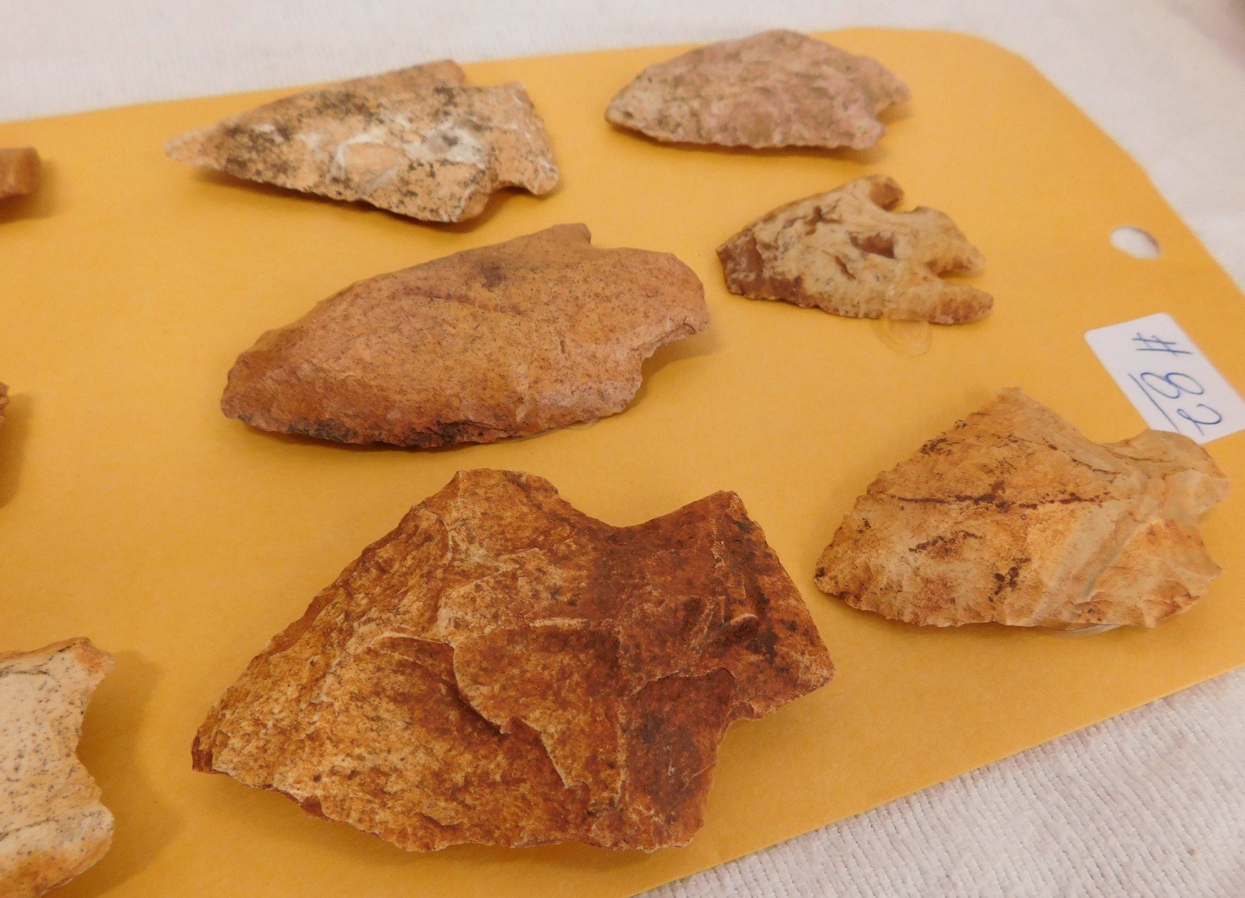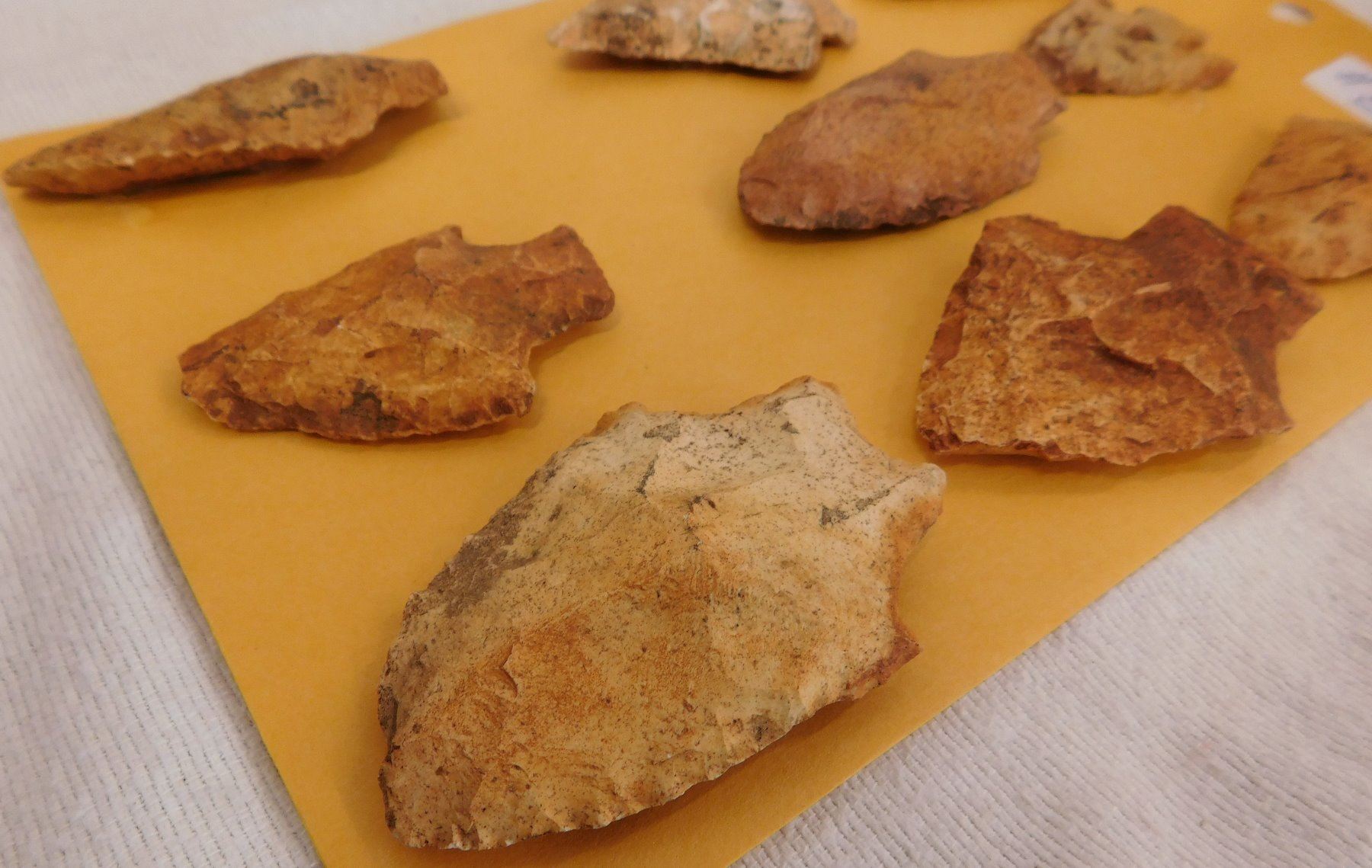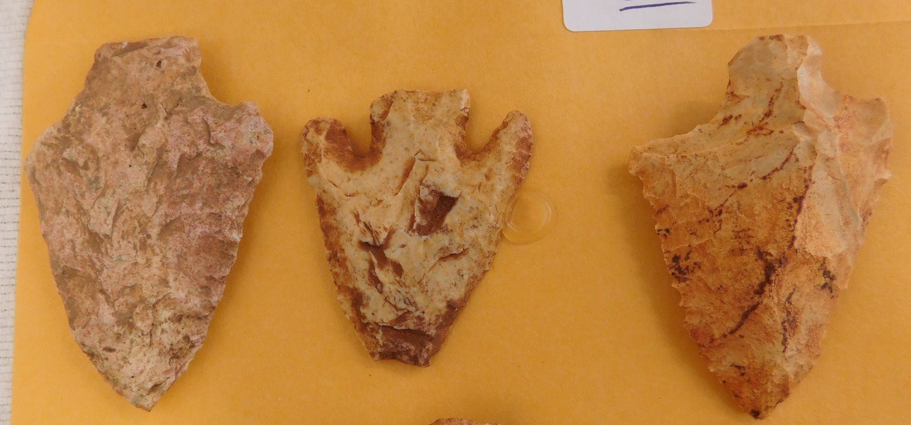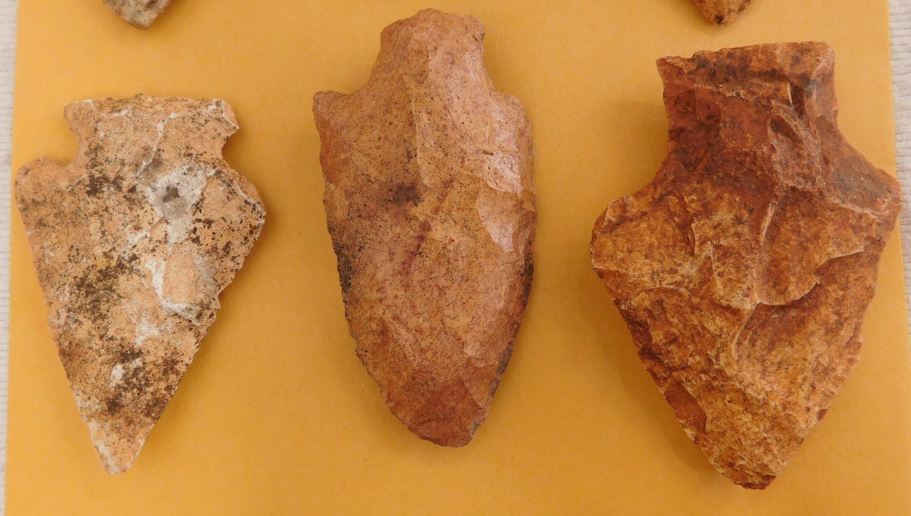 Collection of Spearheads, circa 5000 years old. Made of chert, the items measure from 1.5" to 3". Terrell County, Georgia. Heavy patina, found in the 1940s. Condition: As found, some chips, see images. Shipping: $14.50 w/insurance and signature.