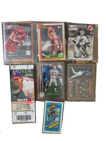 Collection of sports trading cards, including stats on teams and the player's, also a ticket from the World Series (2009) "Philadelphia Phillies vs. Cincinnati Reds" seat 8 suite 53. The collection includes such greats as hockey player Steven Yzerman, baseball player Steven Norman Carlton, all the players from the Phillies, hockey great Martin Brodeur, football legend Dan Marino, and baseball great Ken Griffey Jr.