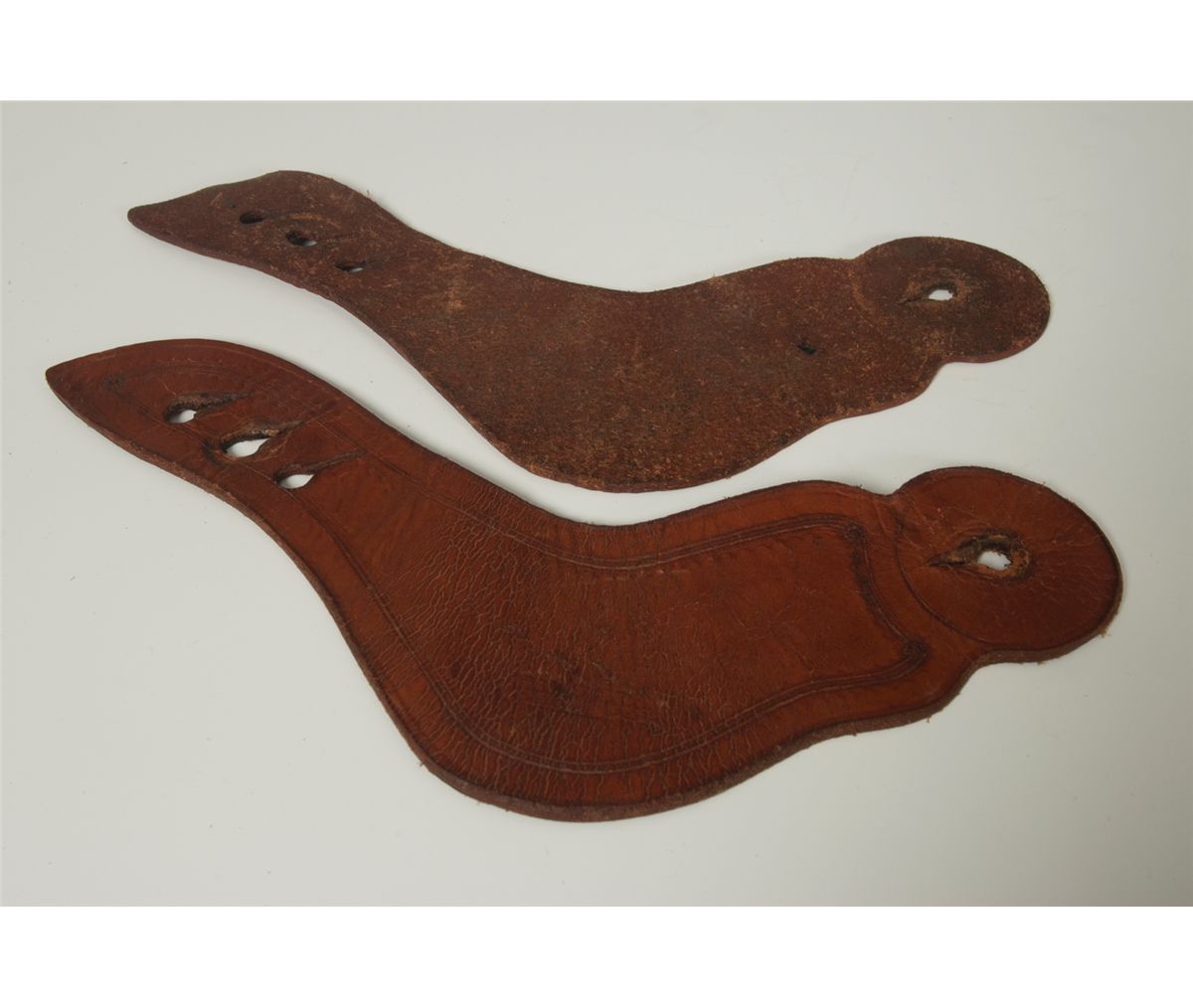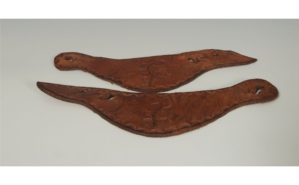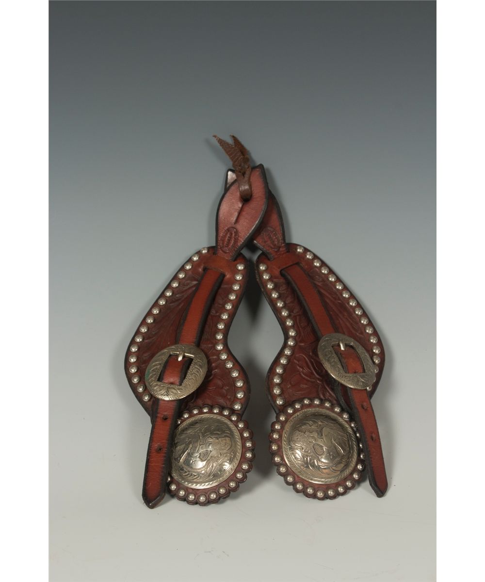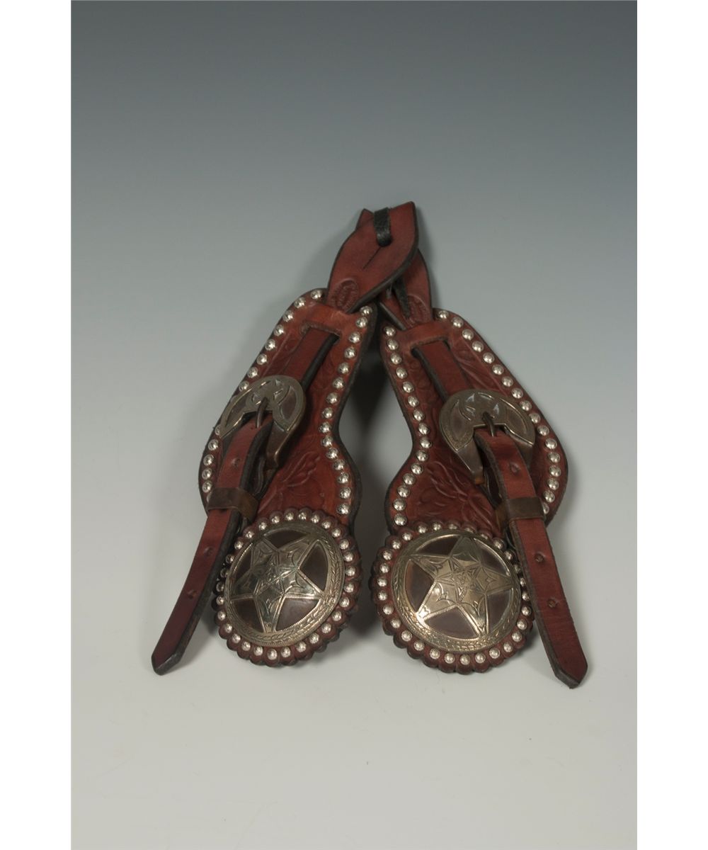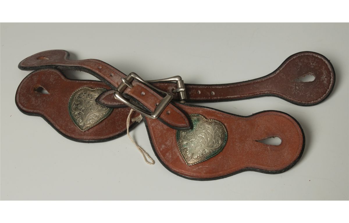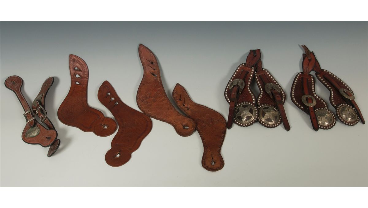 Collection of Spur Straps. 1. John Clark (Shakopee, MN.) studded straps with sterling silver naked lady conchos and buckle. 2. Unmarked gull-wing straps with tooled rose bushes. 3. John Clark (Shakopee, MN.) studded straps with star conchos and buckles. 4. F. A. Meanea (Cheyenne, WY.) gull-wing leather straps with edge embossing. 5. Unmarked straps with silver heart conchos. Provenance: Golden Eagle Trading Co.