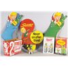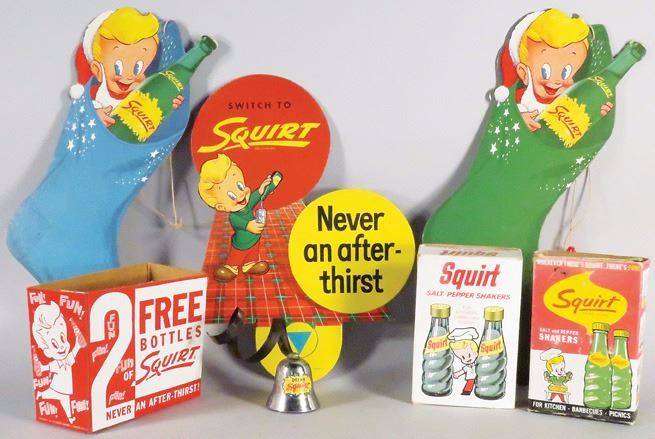 Collection of Squirt Items. (3) Die cut cardboard string hanging signs. (2) sets of salt and pepper shakers in original boxes. Country store door bell and NOS box.