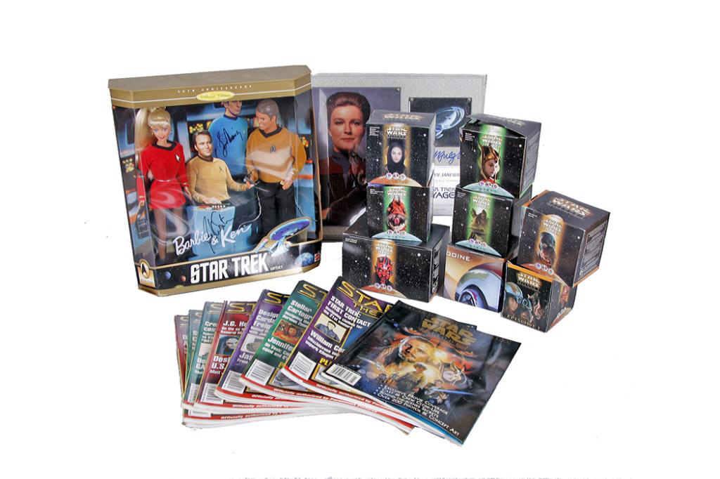 Collection of Star Trek Memorabilia Including a framed pictured of Catherine Janeway, hand signed, limited edition #247/1000, a 30th anniversary collectors edition of Barbie & Ken Star Trek Gift Set, a collection of seven "Star Trek" magazine books, a deIncluding a framed pictured of Catherine Janeway, hand signed, limited edition #247/1000, a 30th anniversary collectors edition of Barbie & Ken Star Trek Gift Set, a collection of seven "Star Trek" magazine books, a deck of Star Trek playingcards in a box "The Next Generation", and a Star Trek poster. Also includes several Star Wars commemorative toy from KFC.